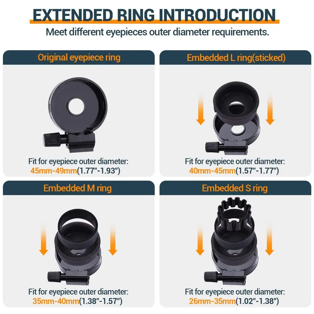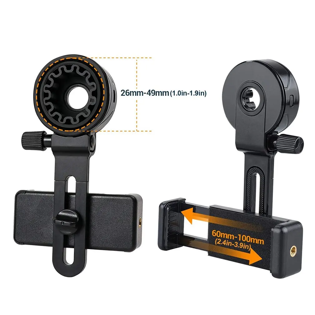 1. Для широкого спектра окуляров: Универсальный держатель адаптера для телефона подходит для окуляров с внешним диаметром 28 мм до 49 мм и может быть установлен на большинстве биноклей, монокуляров, телескопов и зрительных копов, микроскопы.