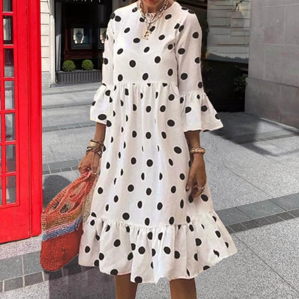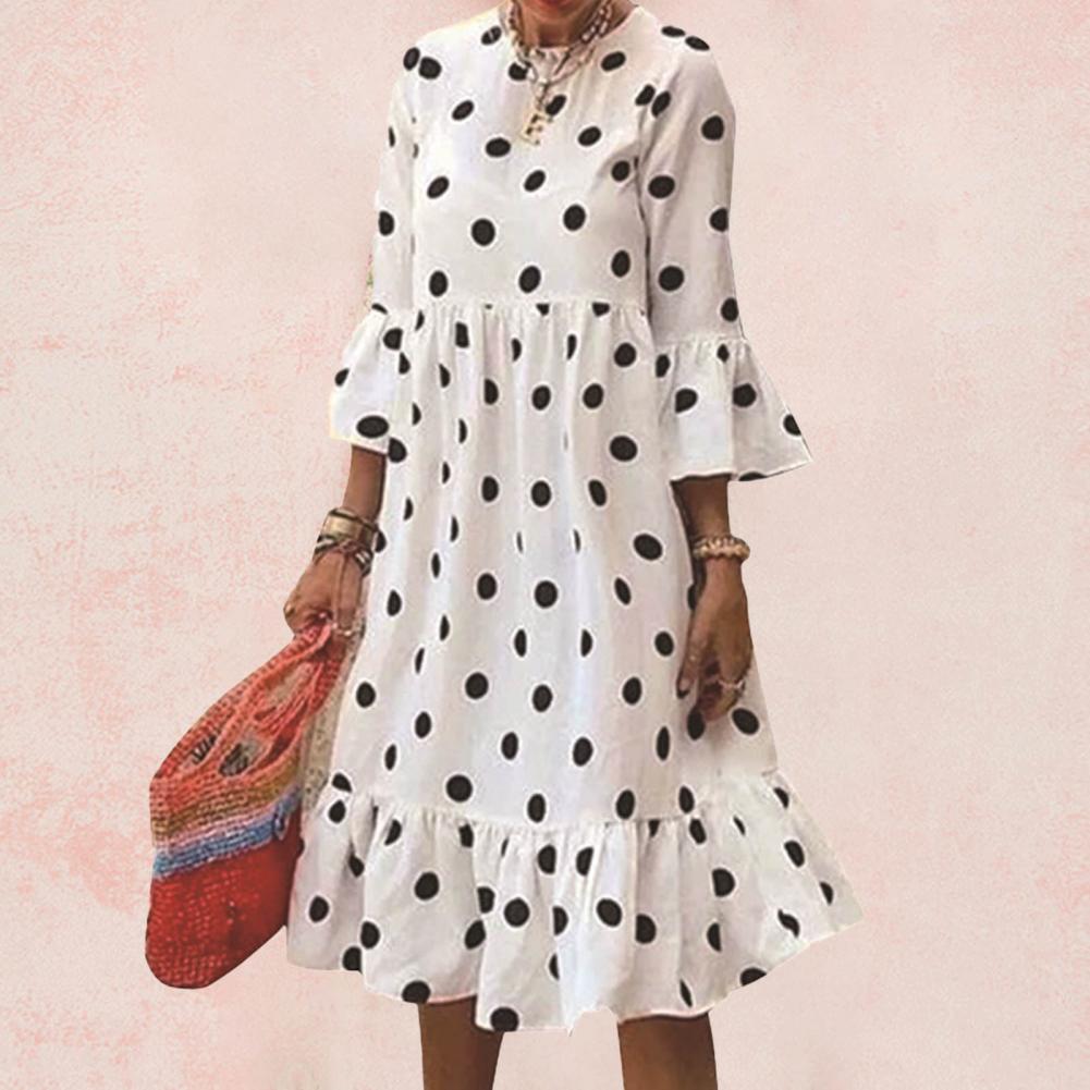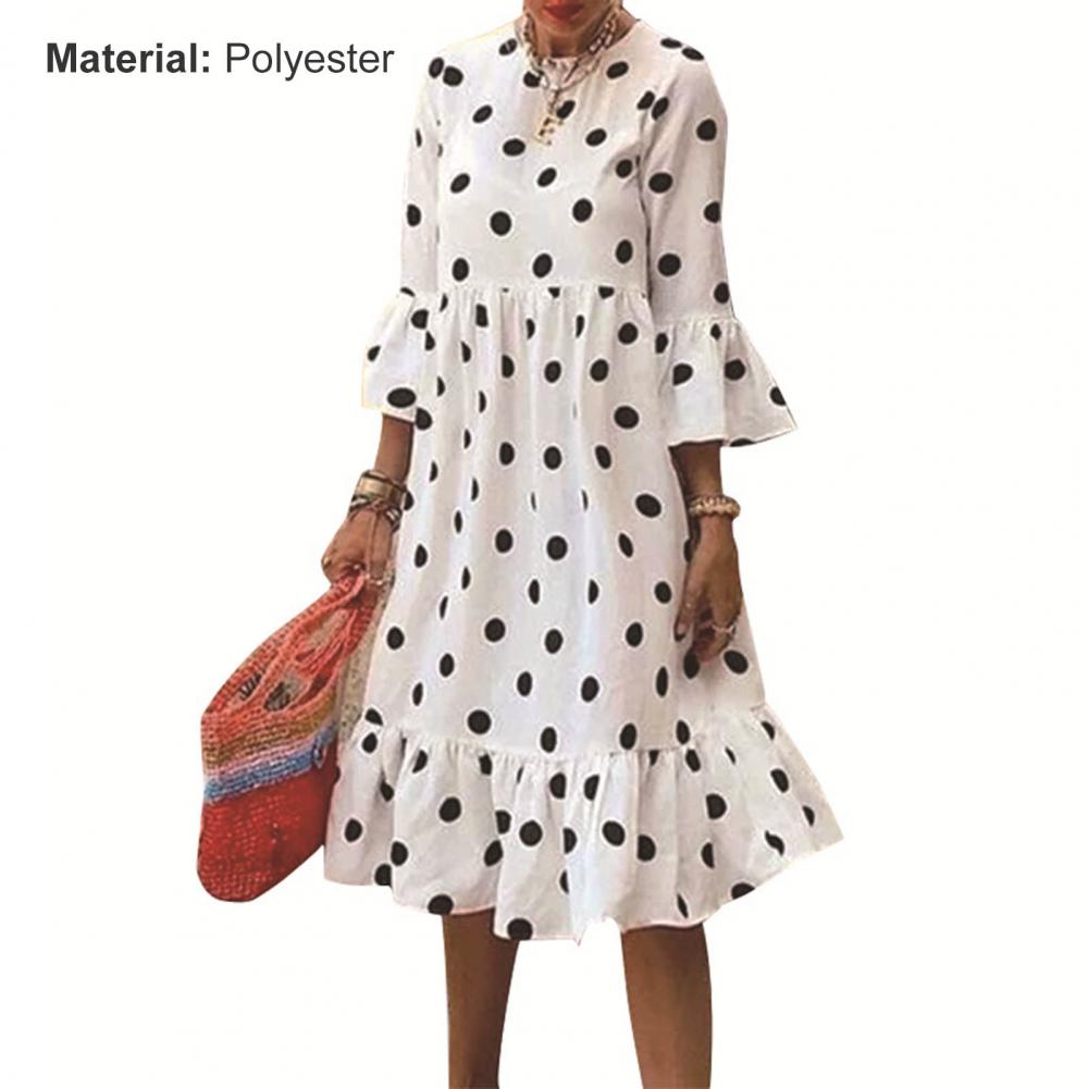 Женское платье с круглым вырезом и высокой талией, платье средней длины в горошек с рукавами 3/4 и оборками, праздничный Сарафан