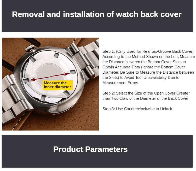 * Перед покупкой рекомендуется измерить диаметр циферблата задней крышки, чтобы избежать недоступности инструмента из-за ошибок в измерениях.