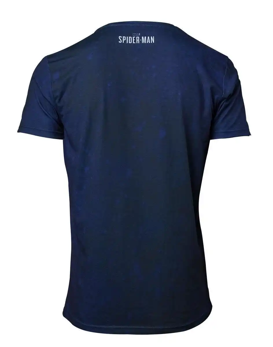 Синяя мужская футболка с принтом Человека-паука, кислотная стирка спереди и текст на спине. Контрастная белая лента на шее