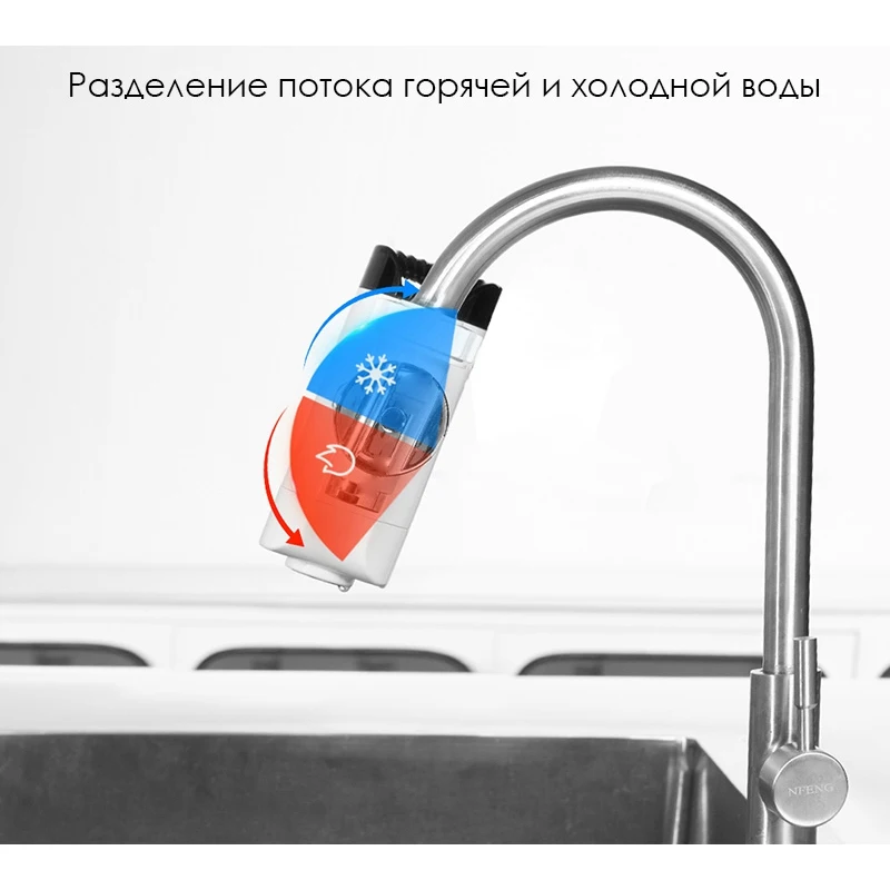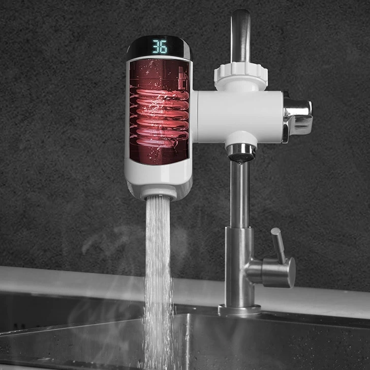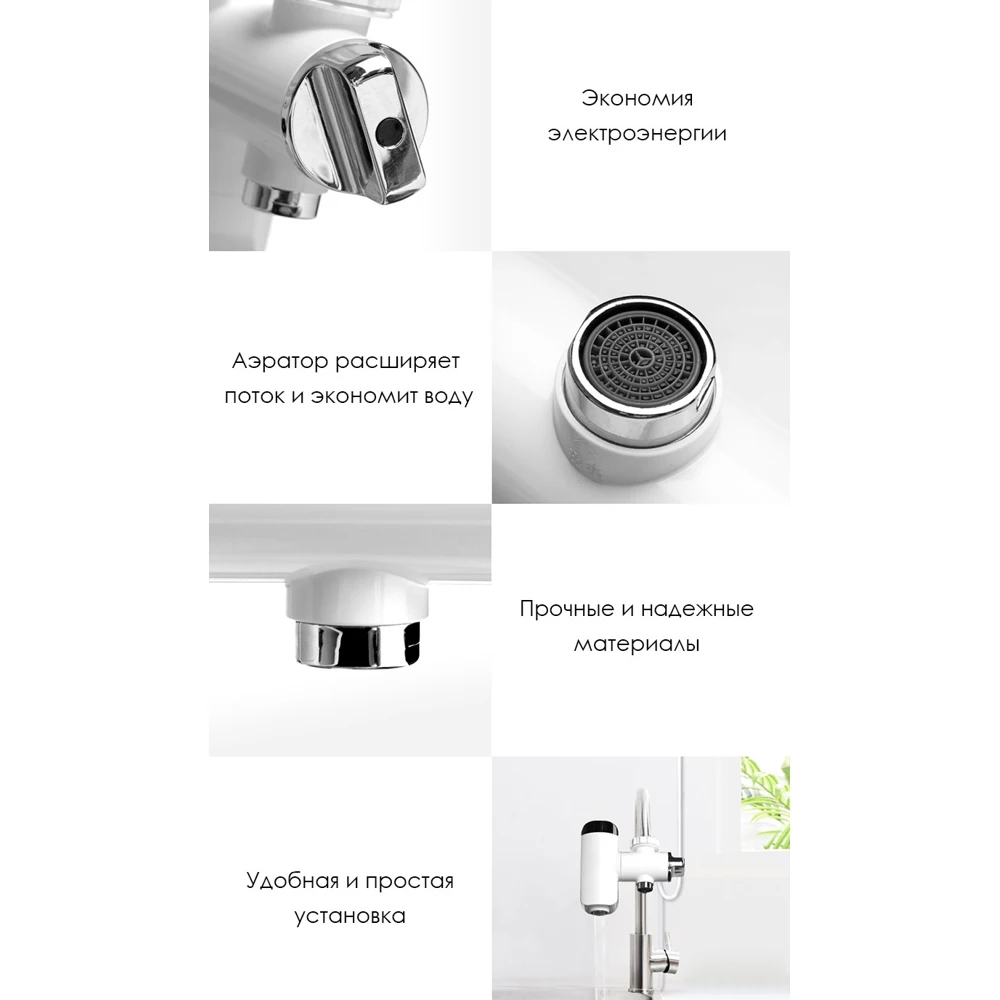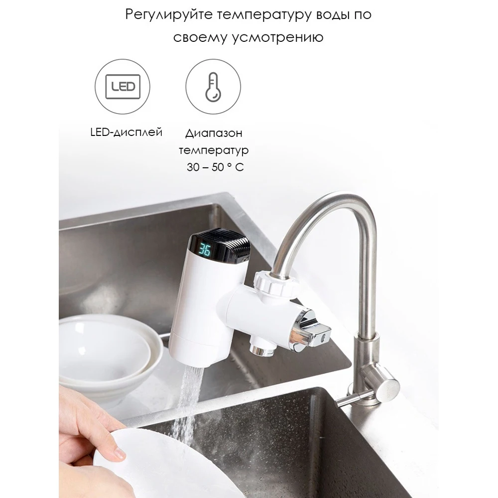 Простая установка, мгновенный нагрев. Водонепроницаемый уровень IPX4. Нагревательный элемент из нержавеющей стали. Диапазон температур от 30 до 50°C. LED дисплей. 6 адаптеров в комплекте.