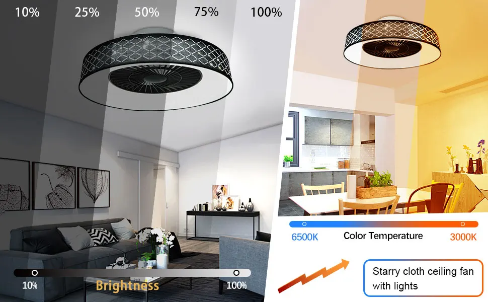 Прежде всего, этот потолочный вентилятор имеет простой и атмосферный дизайн. Абажур звездного неба и черная тканевая оболочка подарят вам абсолютное чувство атмосферы. Во-вторых, три разных цвета светильник можно свободно регулировать, чтобы удовлетворить ваши ежедневные потребности. Три скорости ветра могут быть свободно изменены, чтобы обеспечить вам более комфортный опыт. Кроме того, у нас также есть постоянный сервис, который может увеличить ваше счастье в жизни. Наконец, этот потолочный вентилятор имеет встроенный Безопасный и прочный светодиодный чип, который защищает глаза и более здоровый. И мы также предоставляем полную гарантию качества 12 месяцев. Это идеальное украшение для кухни, спальни, гостиной и т. д.