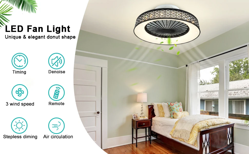 Depuley 47 см светодиодный потолочный вентилятор с регулируемой яркостью, светильник, 3 цвета, температура, невидимые лезвия для спальни, гостиной, кухни
