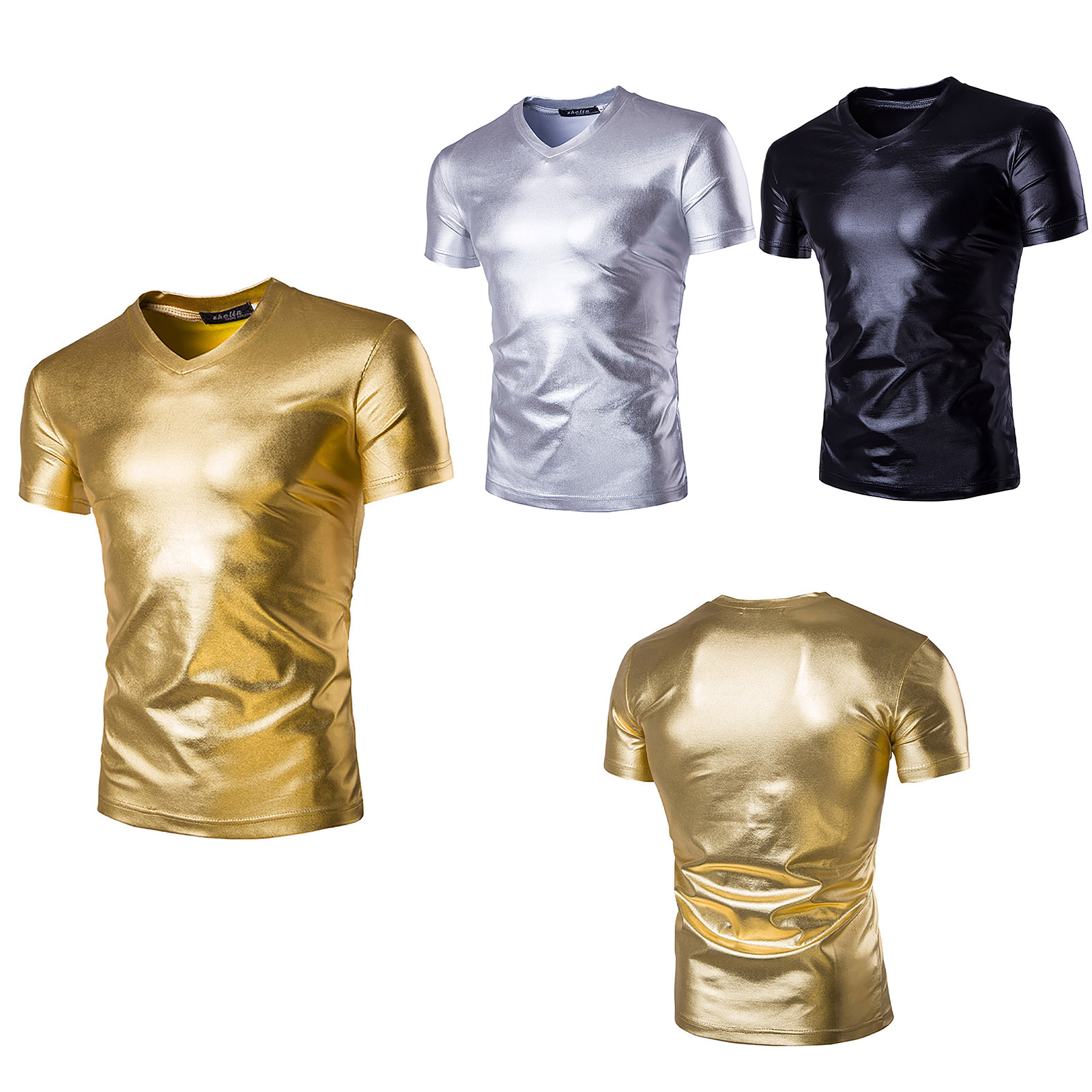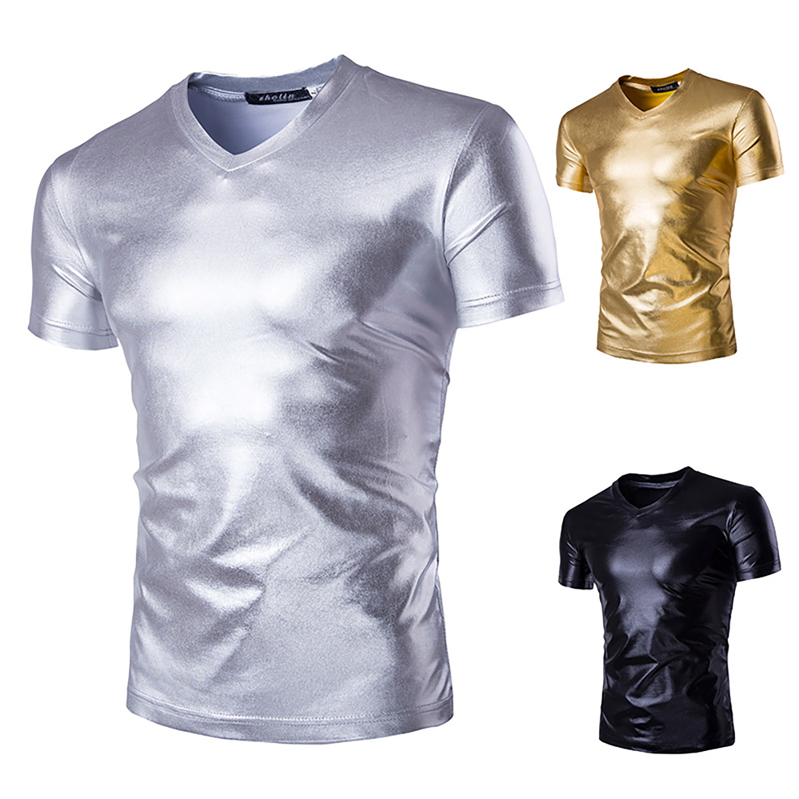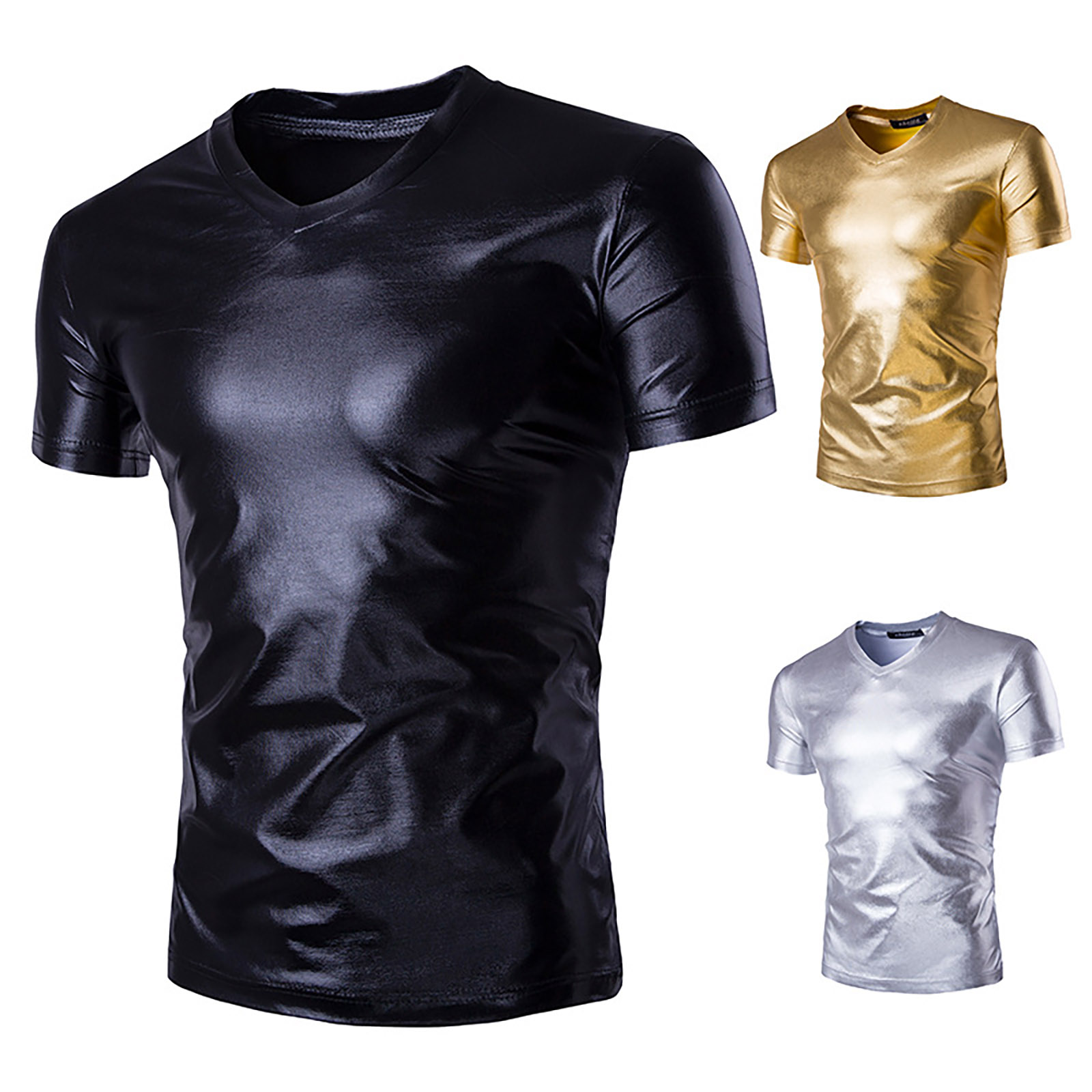 Мужская блестящая металлическая футболка с v-образным вырезом и коротким рукавом, модные однотонные облегающие топы.