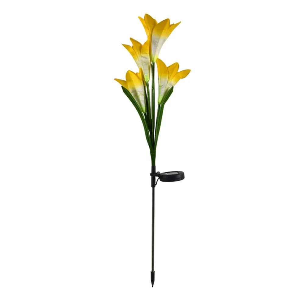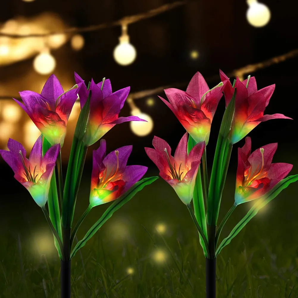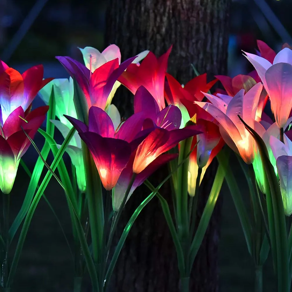 [Светильник, изменяющий 7 цветов и простой в установке] никаких проводов и внешнего электричества не требуется, красивая и изящная Лилия в форме Солнечный Кол светильник s с 7 цветов меняется автоматически светильник в темное время суток для освещения на вашем заднем дворе и путь. Идеально подходит как светильник траектории и наземный светильник, подходит для посадки возле деревьев, клумбы, забора и дорожек и т. Д.