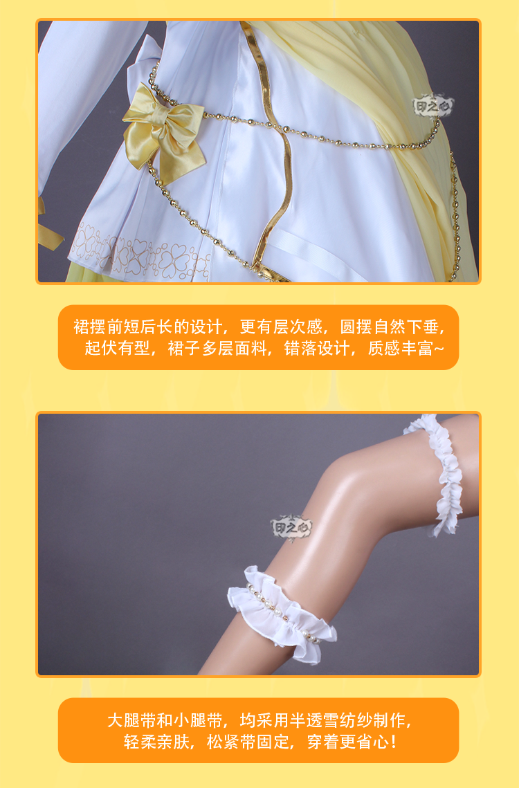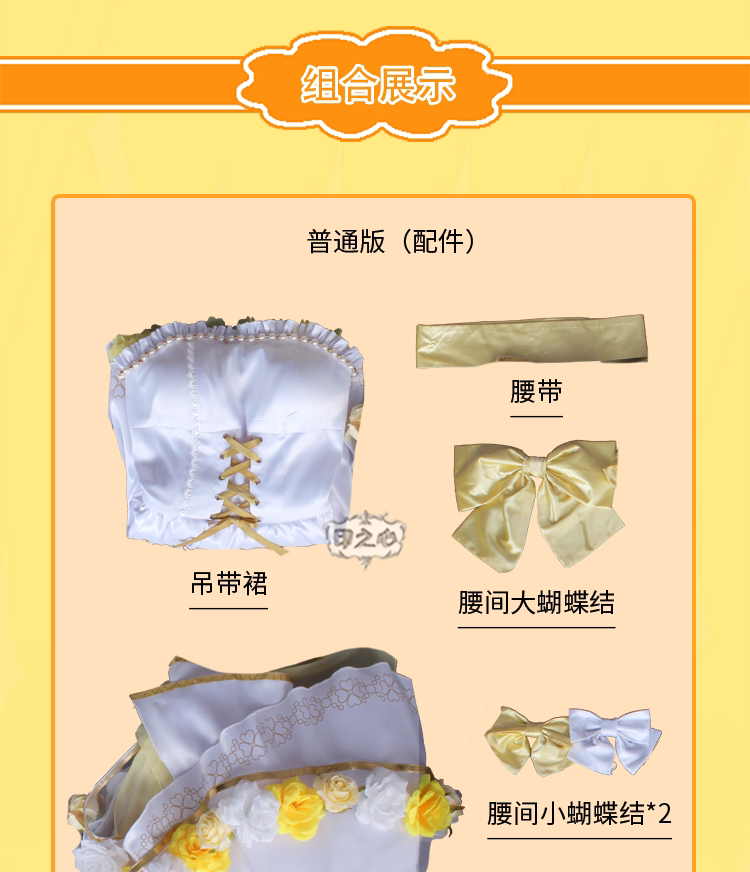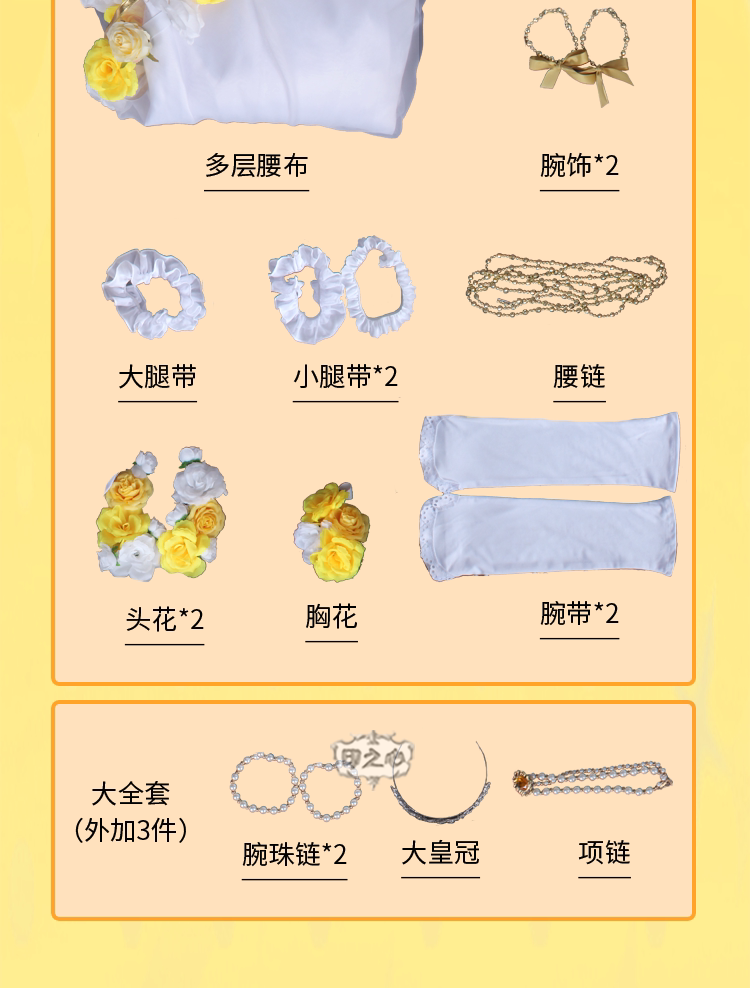 Включает в себя:Юбка на подтяжках + многослойная юбка-пачка + пояс с большим бантом * 1 + Маленький бант на талии * 2 + ремешок на запястье * 2 + ремень для бедра * 1 + ремешок на щиколотке * 2 + поясная цепочка * 1 + головка цветок * 2 + корсаж * 1 + браслет * 2 + цепочка на грудь * 1+ Корона + наручные бусины * 2 + ожерелье * 1