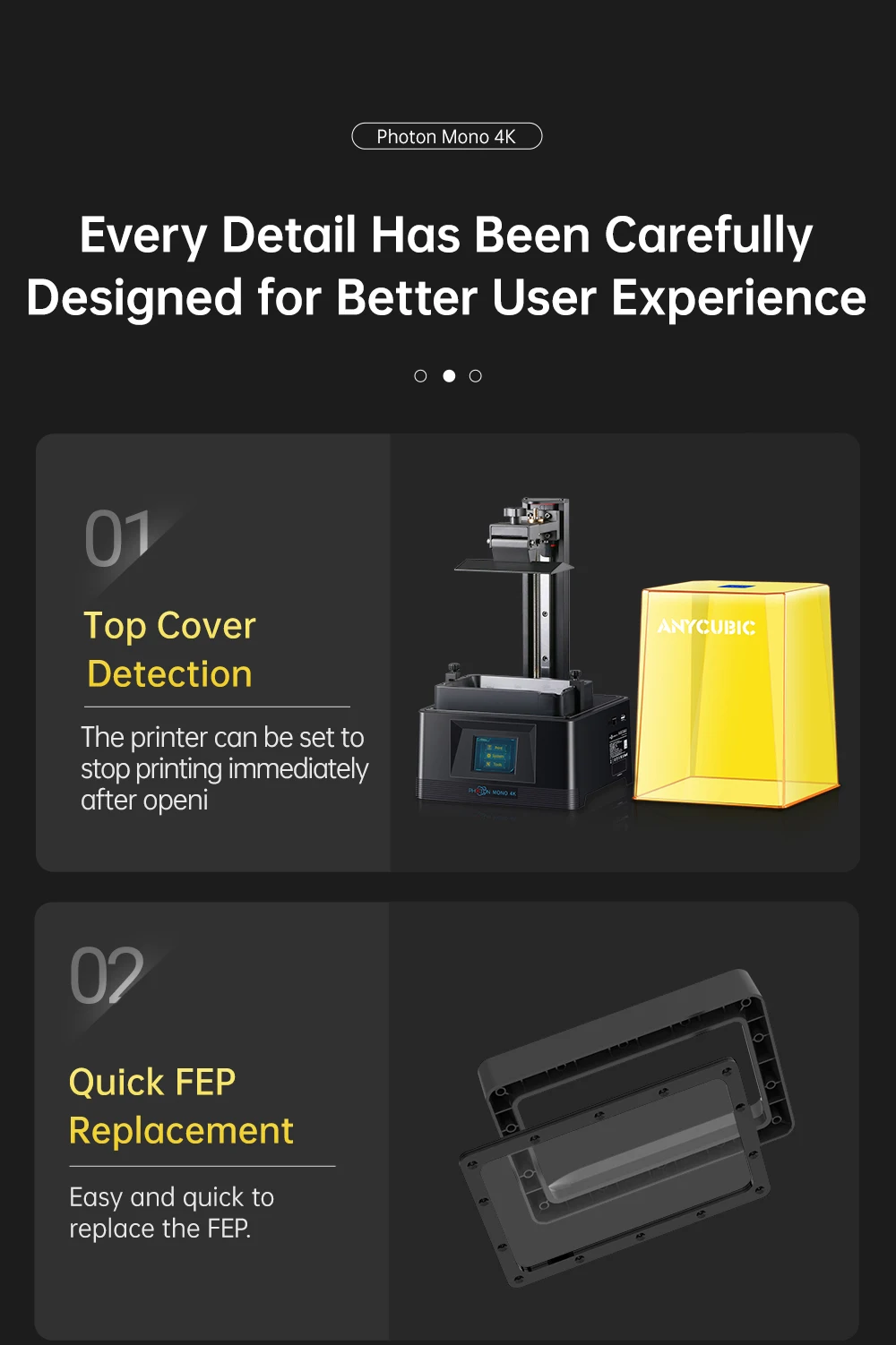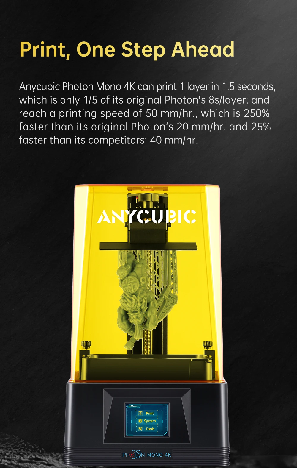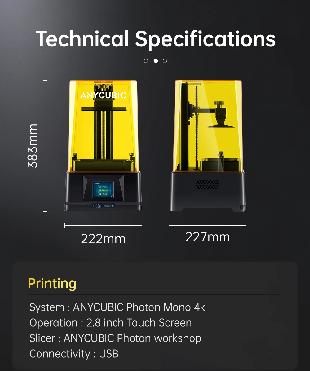 Подойдет как для повседневной носки, так 4K имеет 3840 × 2400 разрешение печати, 35um XY пикселей и 7% светильник с высоким коэффициентом пропускания, которая может доставить высокоизолированный блок питания детализированные принты. Однослойная время отверждения составляет всего 1,5 секунд, и скорость печати может достигать 50 мм/час.