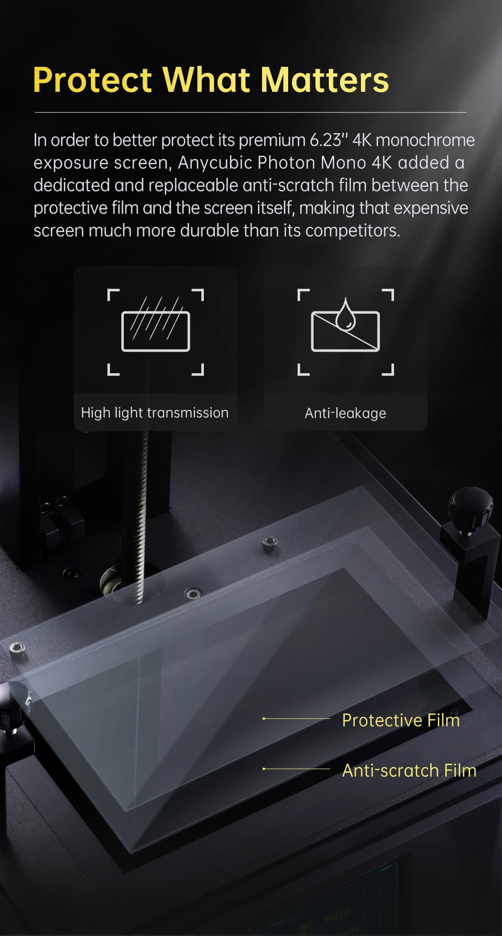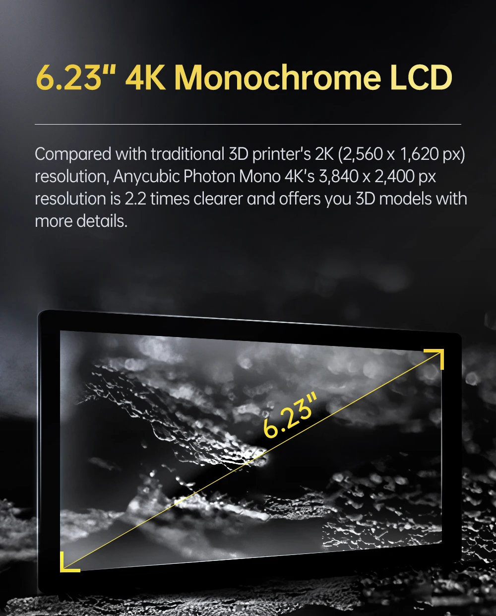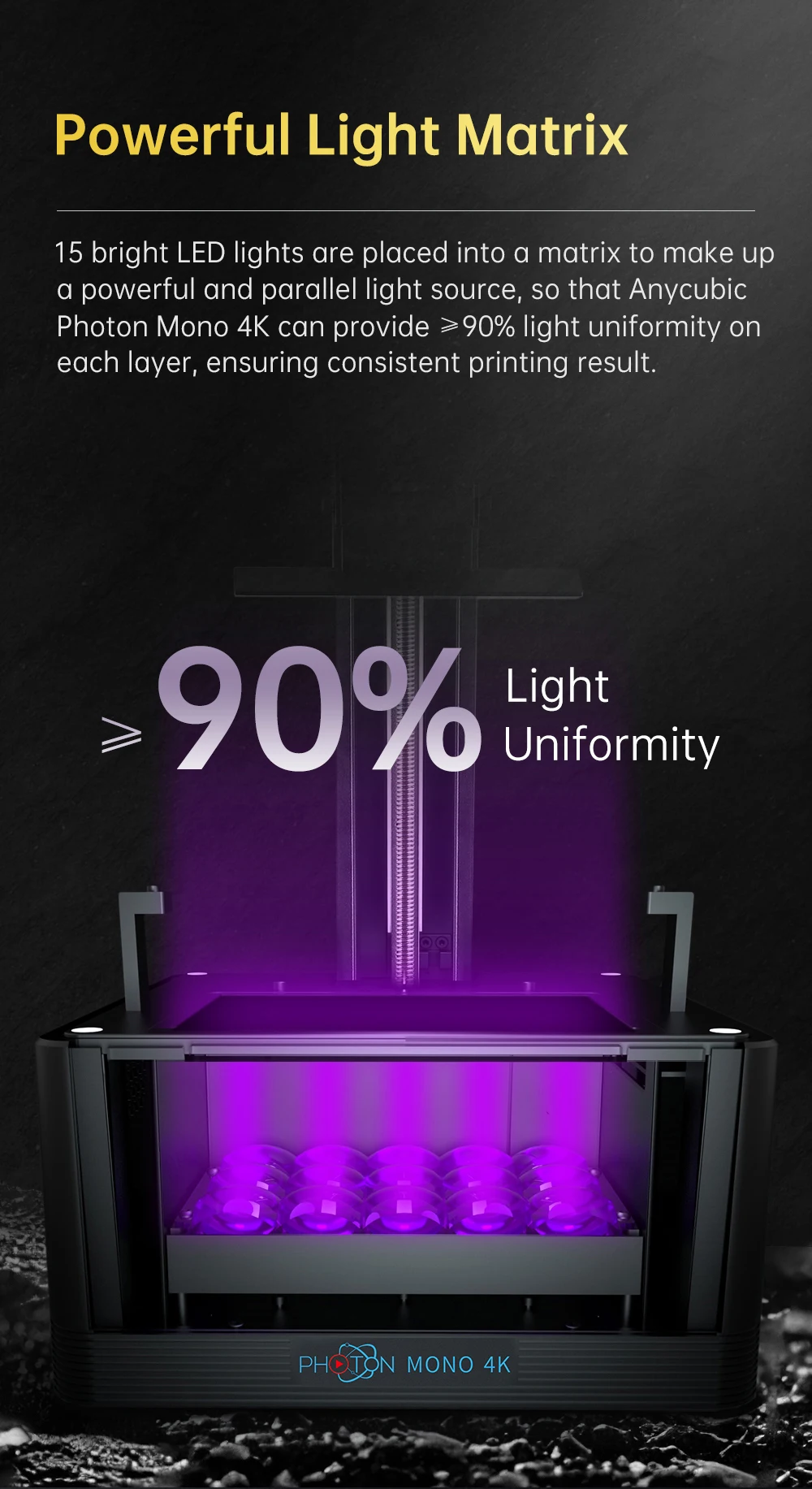 Mono 4K использует Монохромный экран с контрастностью более 350. Высокая контрастность делает изображение в области экспозиции более точным и края печати более деликатными, тем самым улучшая качество печати и процент успеха, а также значительно уменьшая остатки смолы НДС.