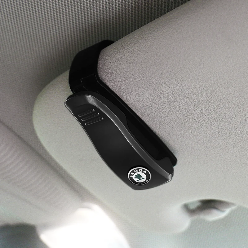 Автомобильный держатель для очков с логотипом, солнцезащитный козырек, солнцезащитные очки, зажим для карты, подставка для билета, аксессуары для Skoda Octavia Fabia Rapid Kodiaq Superb Yeti