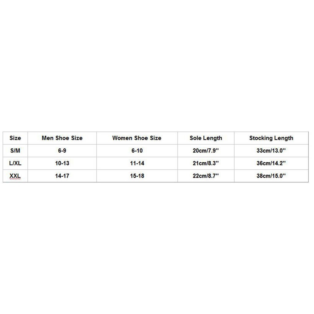 Размеры Размер мужской обуви Размер женской обуви Длина подошвы Длина чулок S/M 6-9 6-10 20 см/7,9'' 33 см/13,0'' L/XL 10-13 11-14 21 см/8,3'' 36 см/14,2'' XXL 14-17 15-18 22 см/8,7'' 38 см/15,0''