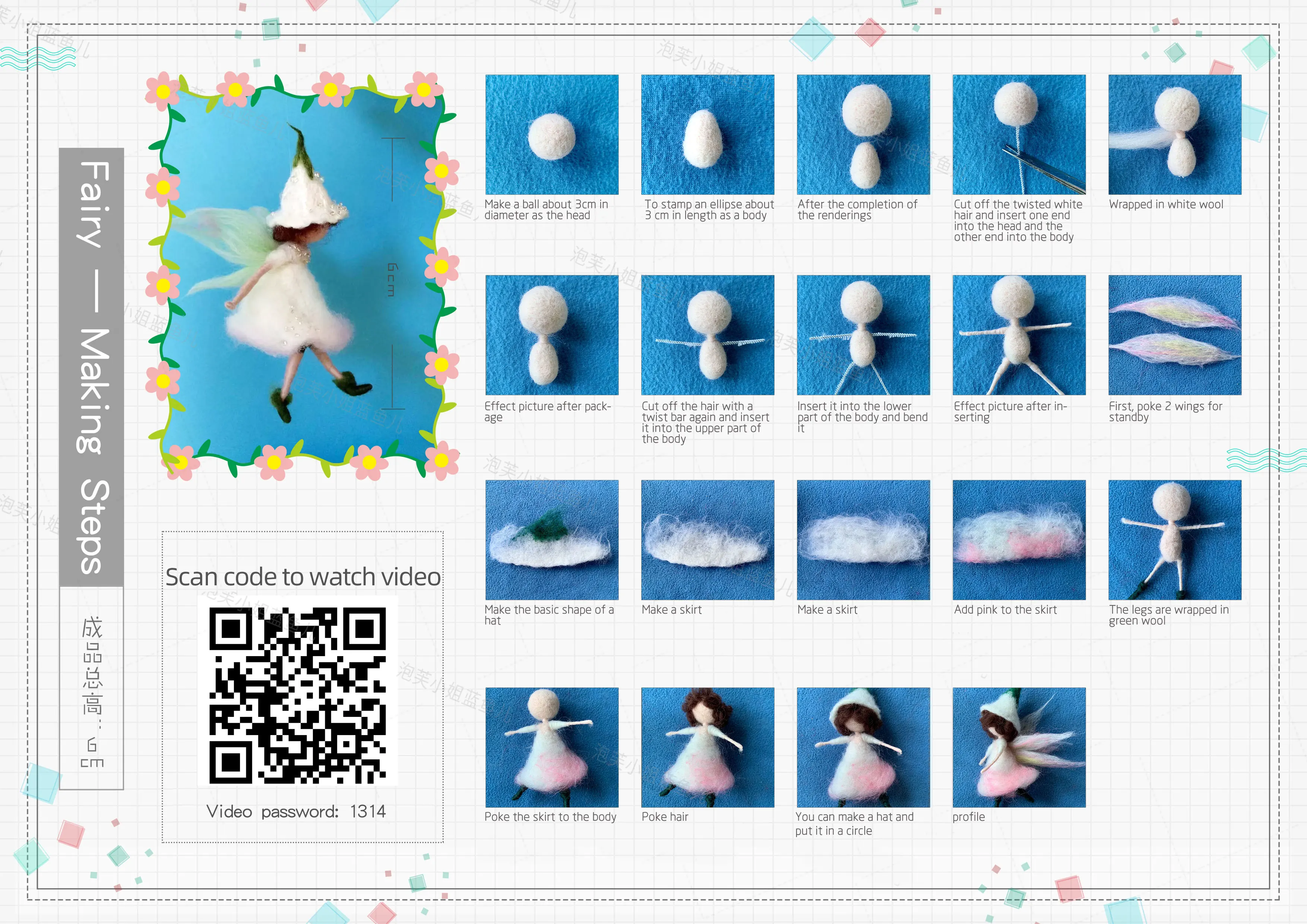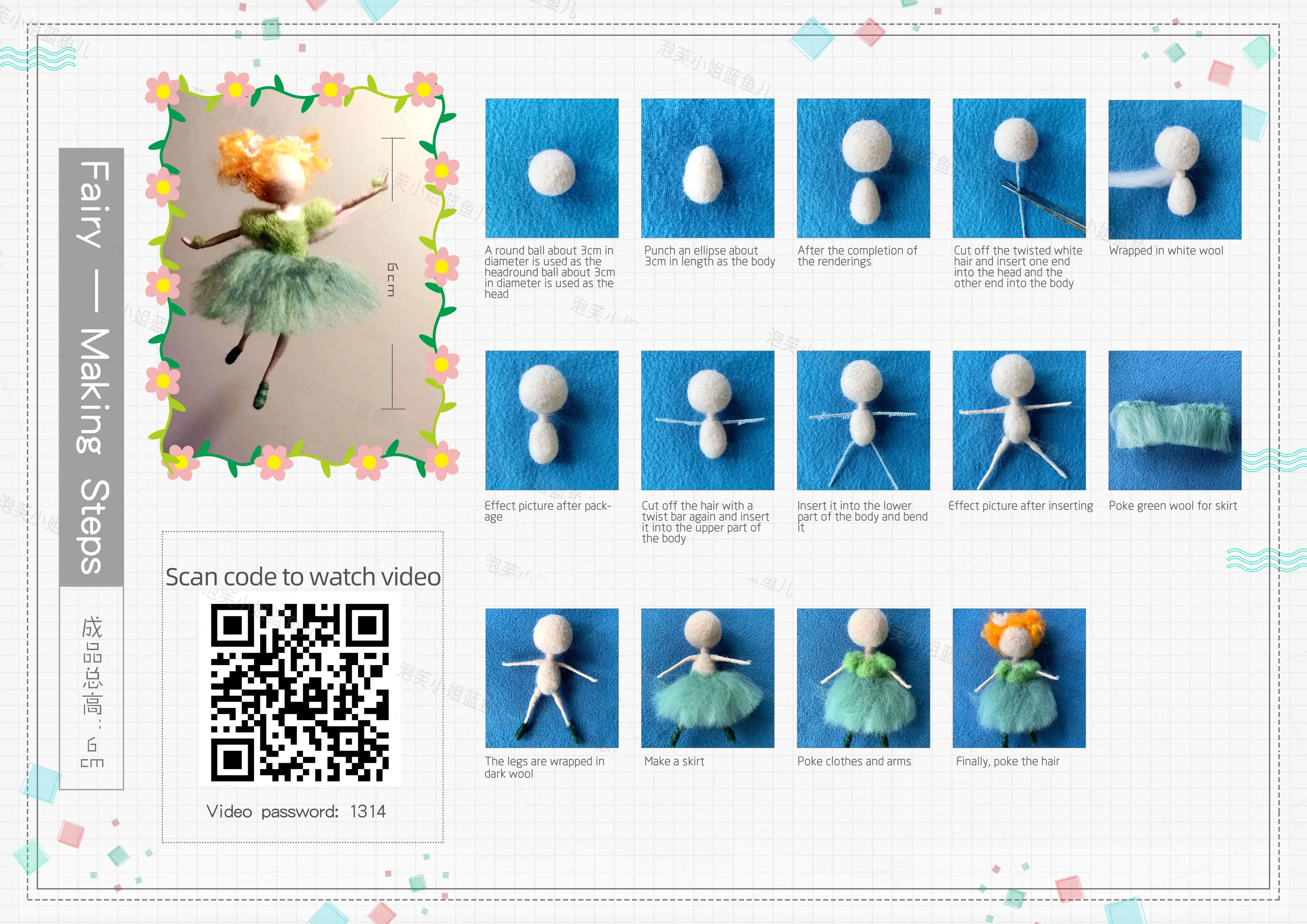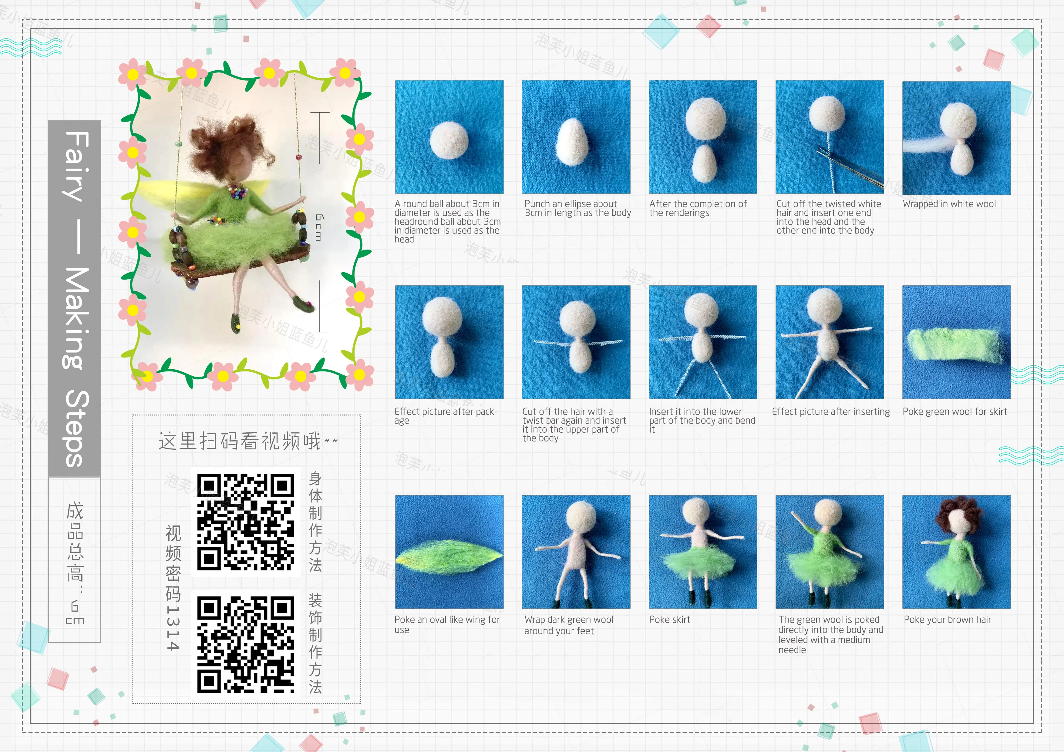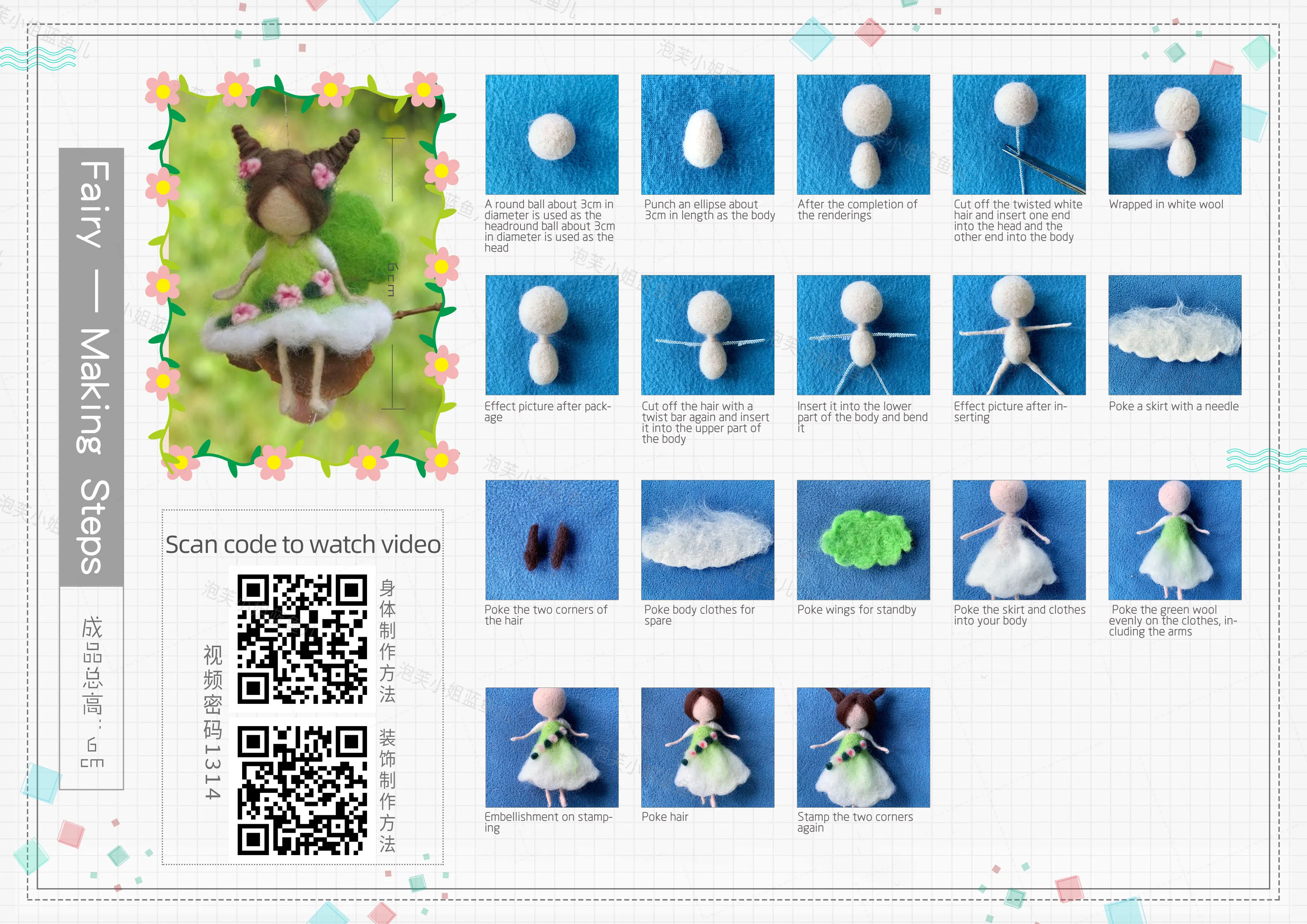 You can scan the QR code to watch the video or follow the instructions to make a cute woolen doll