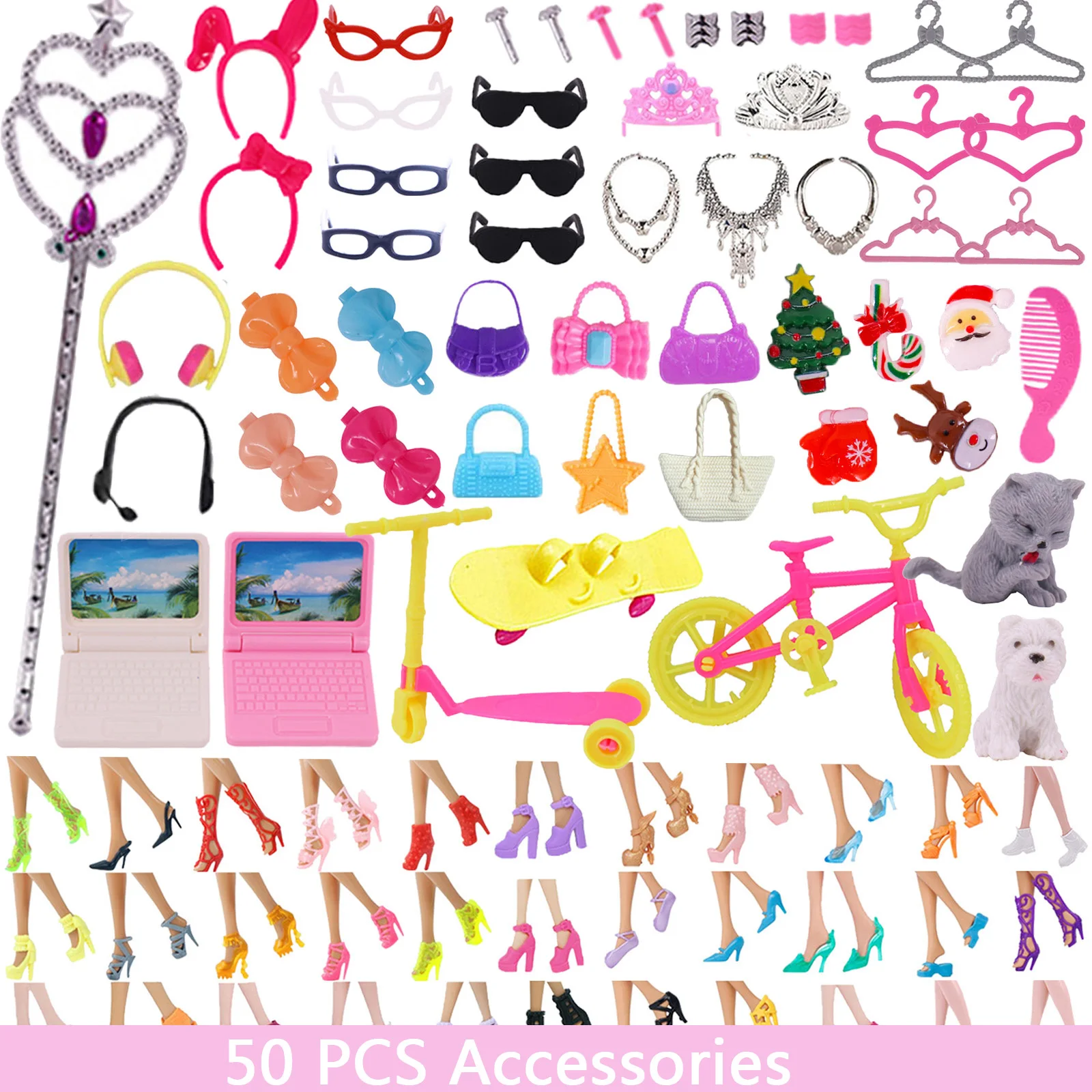 50 шт. аксессуары для Барби = 2 черные очки + 2 цветные очки + 2 солнцезащитные очки + 2 повязки на голову + 2 сумки + 2 черные наушники + 1 Желтые наушники + 2 короны + 3 ожерелья + 6 вешалок + 2 красных ушные Шпильки + 2 красных браслета + 2 серебряные шпильки для ушей + 2 серебряные браслеты + 2 заколки для волос + 4 обуви + 1 Скейтборд + 1 скутер + 1 велосипед + 1 расческа + 1 волшебная палочка + 1 ноутбук + 1 животное + смола 5