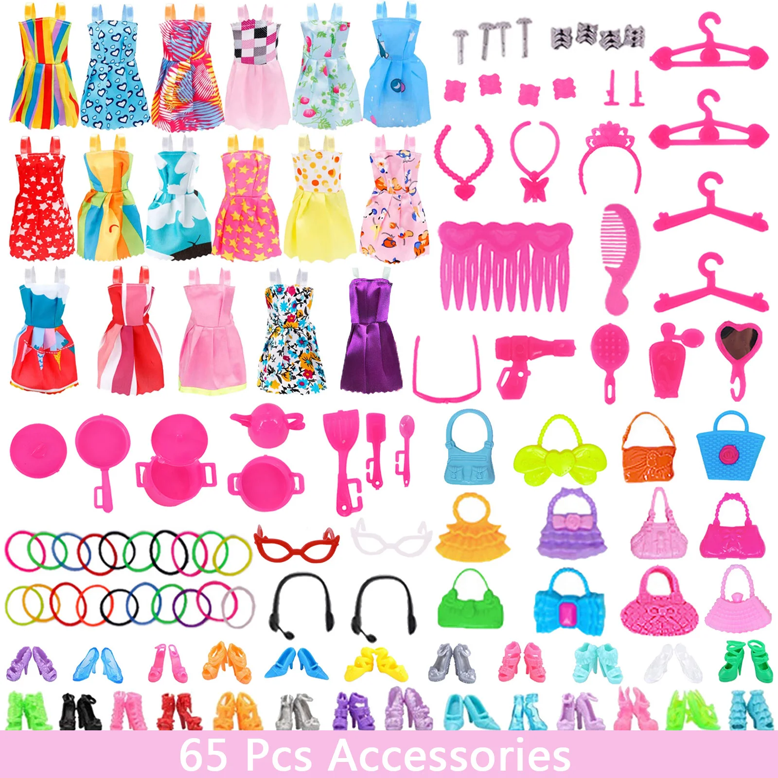 65 шт. аксессуары для Барби = 9 комплектов кухонной посуды + 9 комплектов расчесок + 10 комплектов вешалок + 5 предметов одежды + 10 туфель + 10 резинок + красные серьги 2 4 серебряных браслета + 4 белые серьги + 1 расческа + 2 цветные очки + 1 черные наушники + 1 сумка