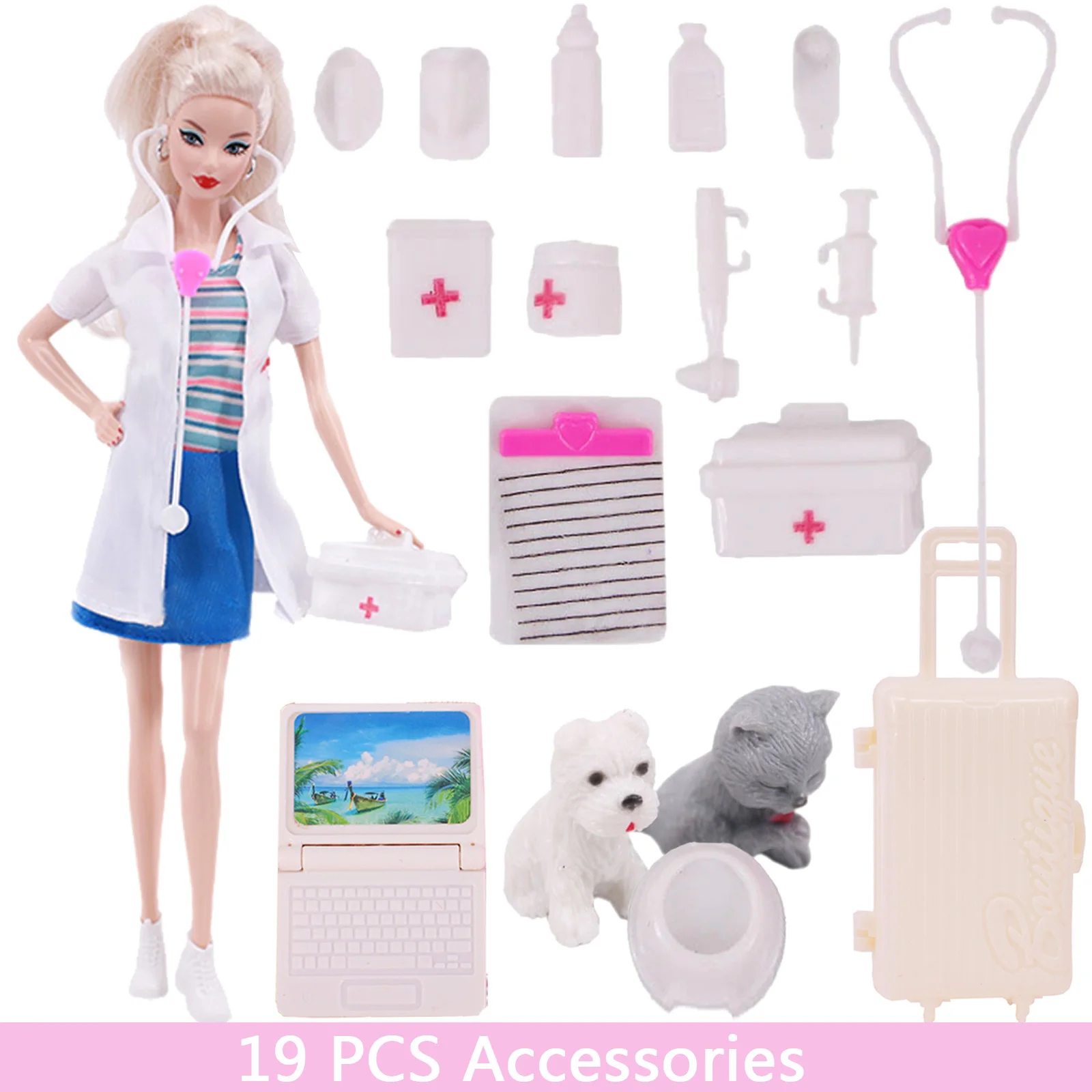 19 шт. аксессуары для Барби = 15 комплектов стетоскопов + одежда для доктора + чемодан + 1 белая тетрадь + 1 пара белых туфель