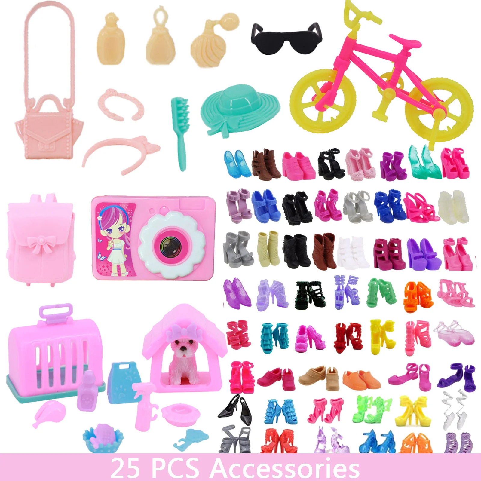 25 шт. аксессуары для Барби = 11 домашних костюмов + 8 аксессуаров + 1 рюкзак + 1 пара белых туфель + 1 камера + 1 очки + 1 велосипед