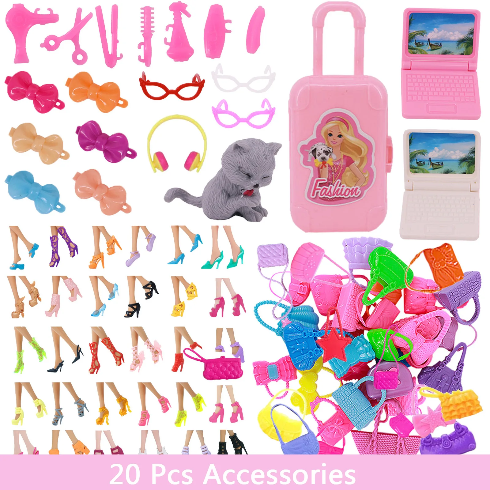 20 шт. набор аксессуаров для Барби = 1 сумка + 2 заколки для волос + 4 туфли + 1 чемодан + 7 шт. ФЕН + 1 компьютер + 2 цветные очки + 1 желтый наушник