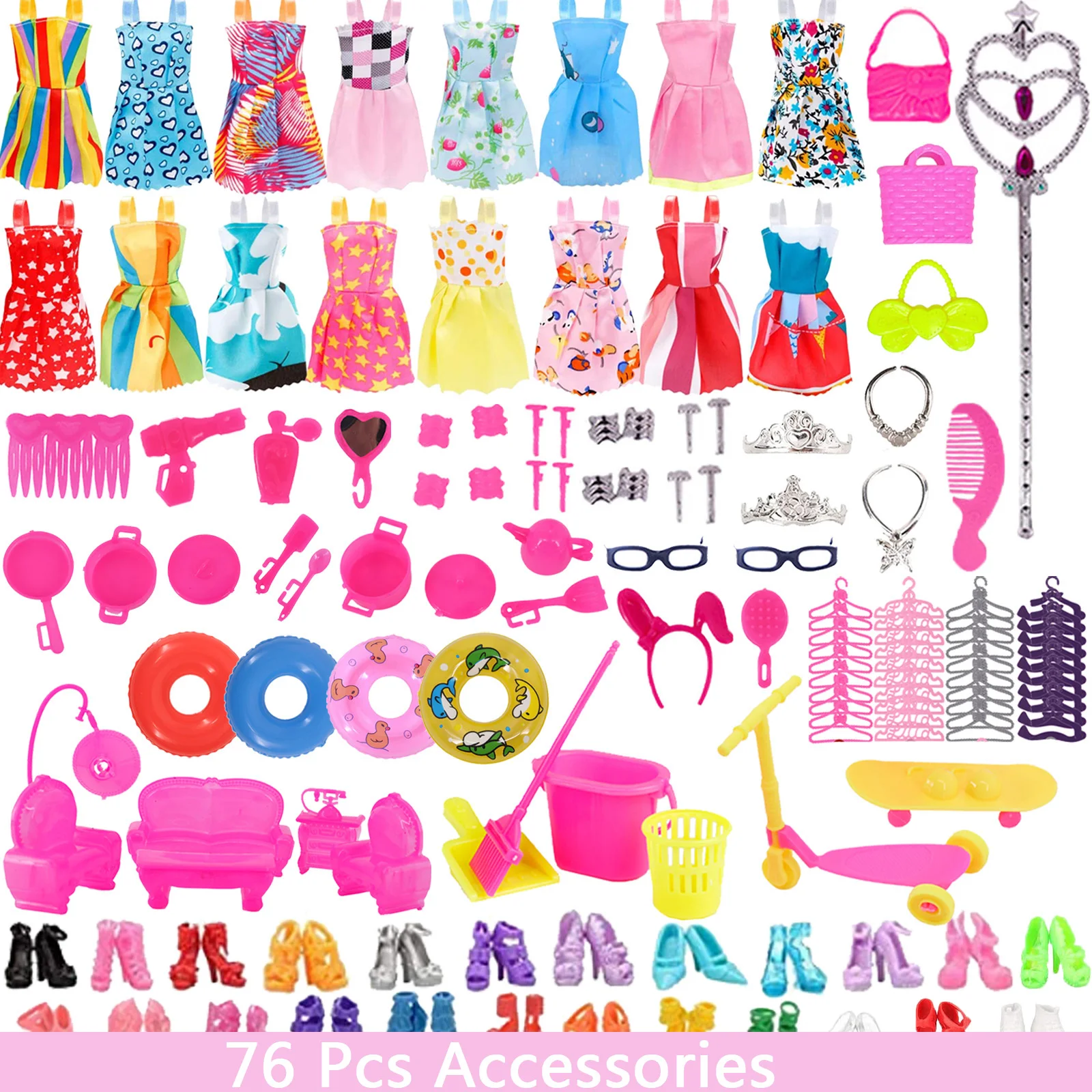 76 шт. аксессуары для Барби = 9 комплектов кухонной утвари + форма для дивана 6 комплектов + 9 комплектов расчесок + 4 комплекта для чистки + 4 красных сережек + 4 серебряных браслета + 4 белых сережек + 2 серебряных короны + 2 ожерелья + 1 повязка на голову + 1 расческа + 2 сумки + 1 кольцо для плавания + 1 волшебная палочка + 10 вешалок + 10 туфель + 5 вещей + 2 черных очков + 1 Скейтборд + 1 скутер
