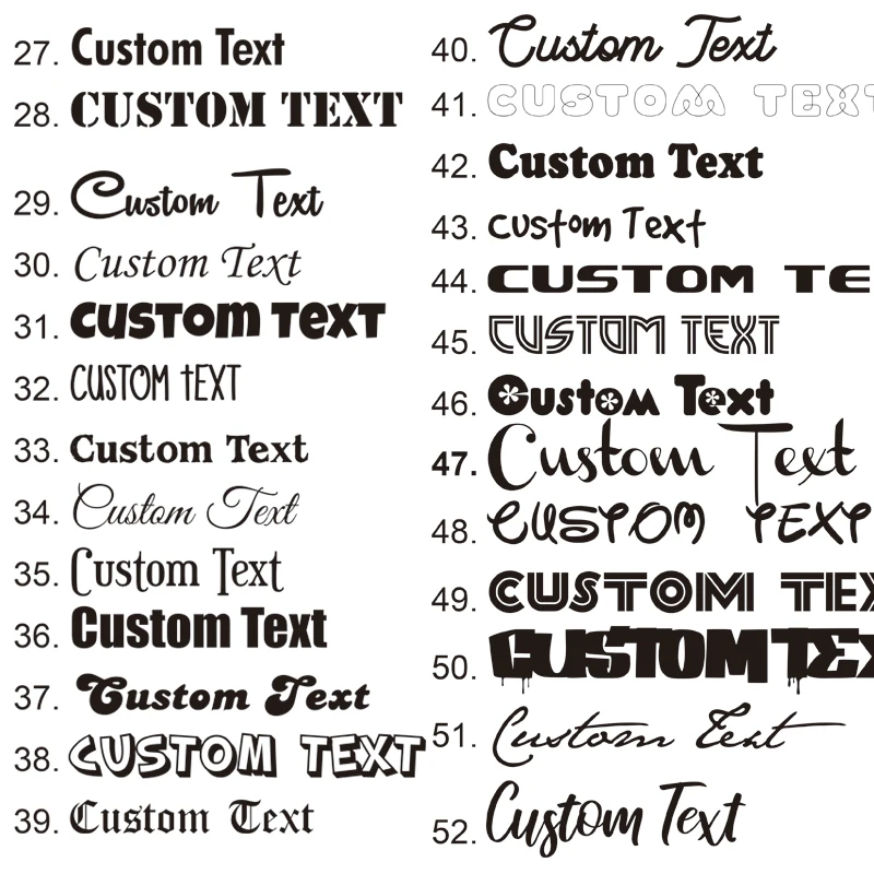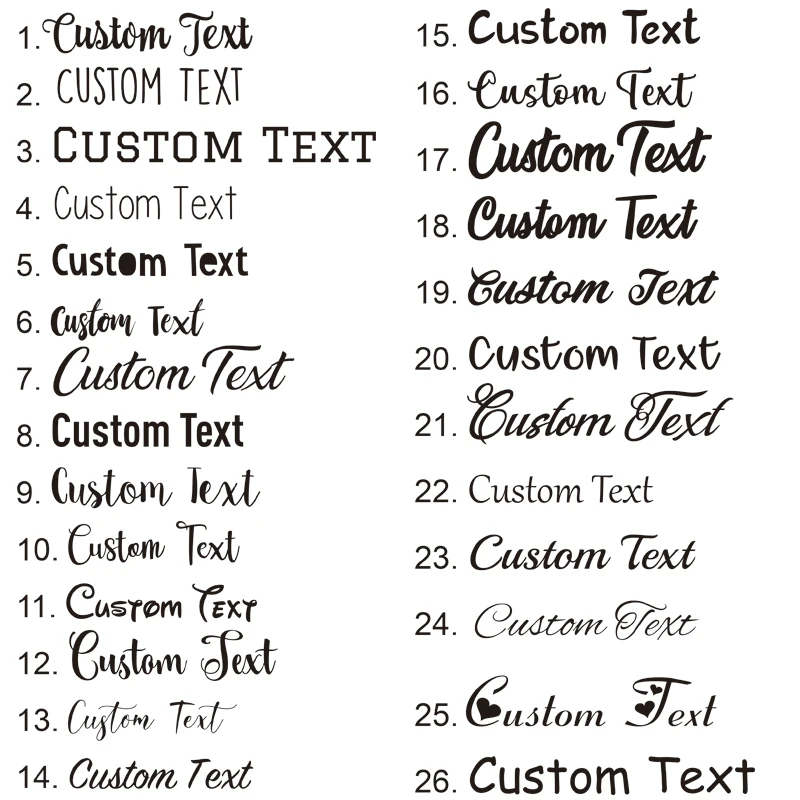 Размер зависит от высоты по ширине (ширина также называется длиной), в зависимости от того, что происходит в первую очередь. Размер каждой этикетки будет варьироваться в зависимости от длины имени. Мы будем использовать шрифт по умолчанию, если покупатель не смог предложить информацию о шрифте.)
