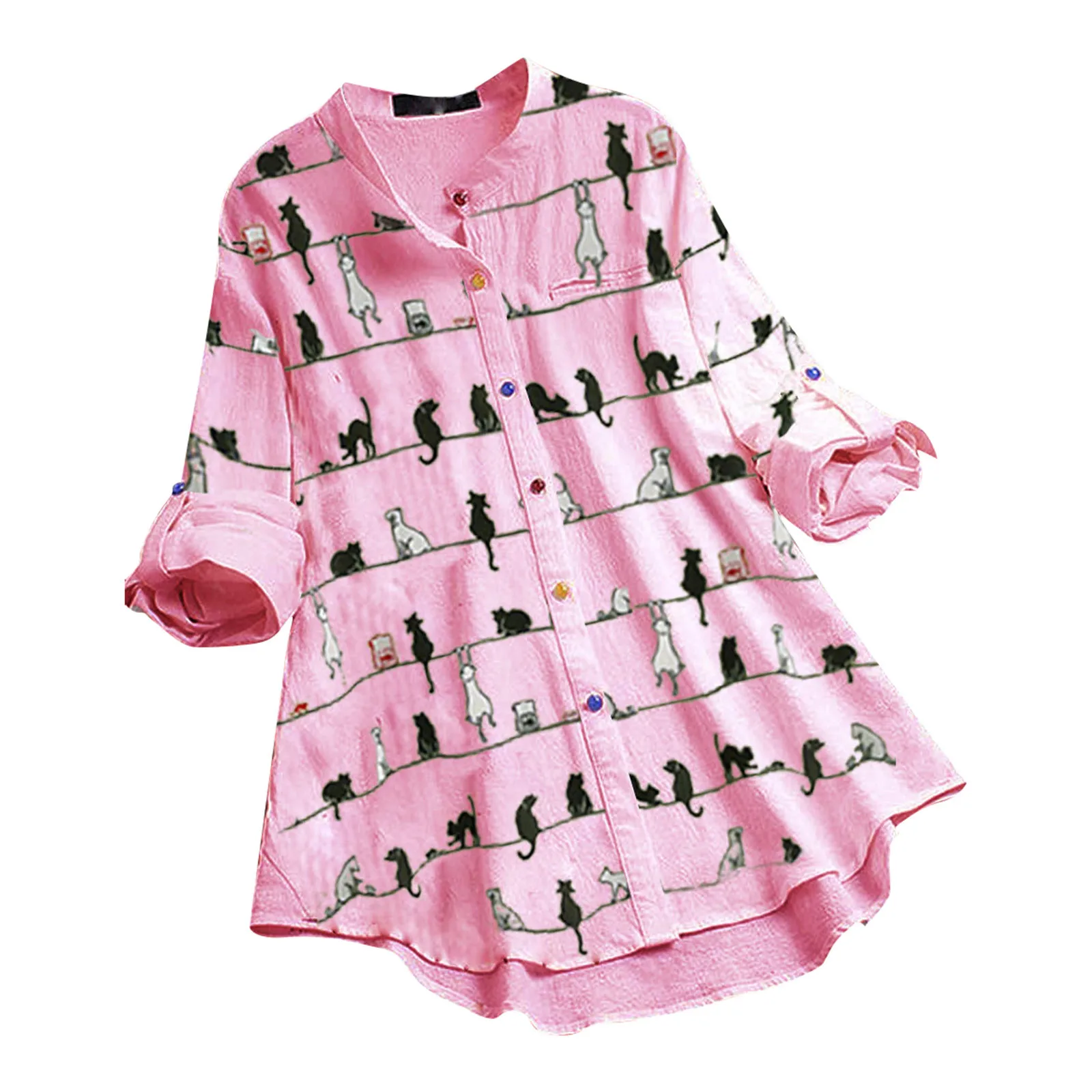 Женская Повседневная Свободная рубашка с длинным рукавом и круглым вырезом с принтом кота