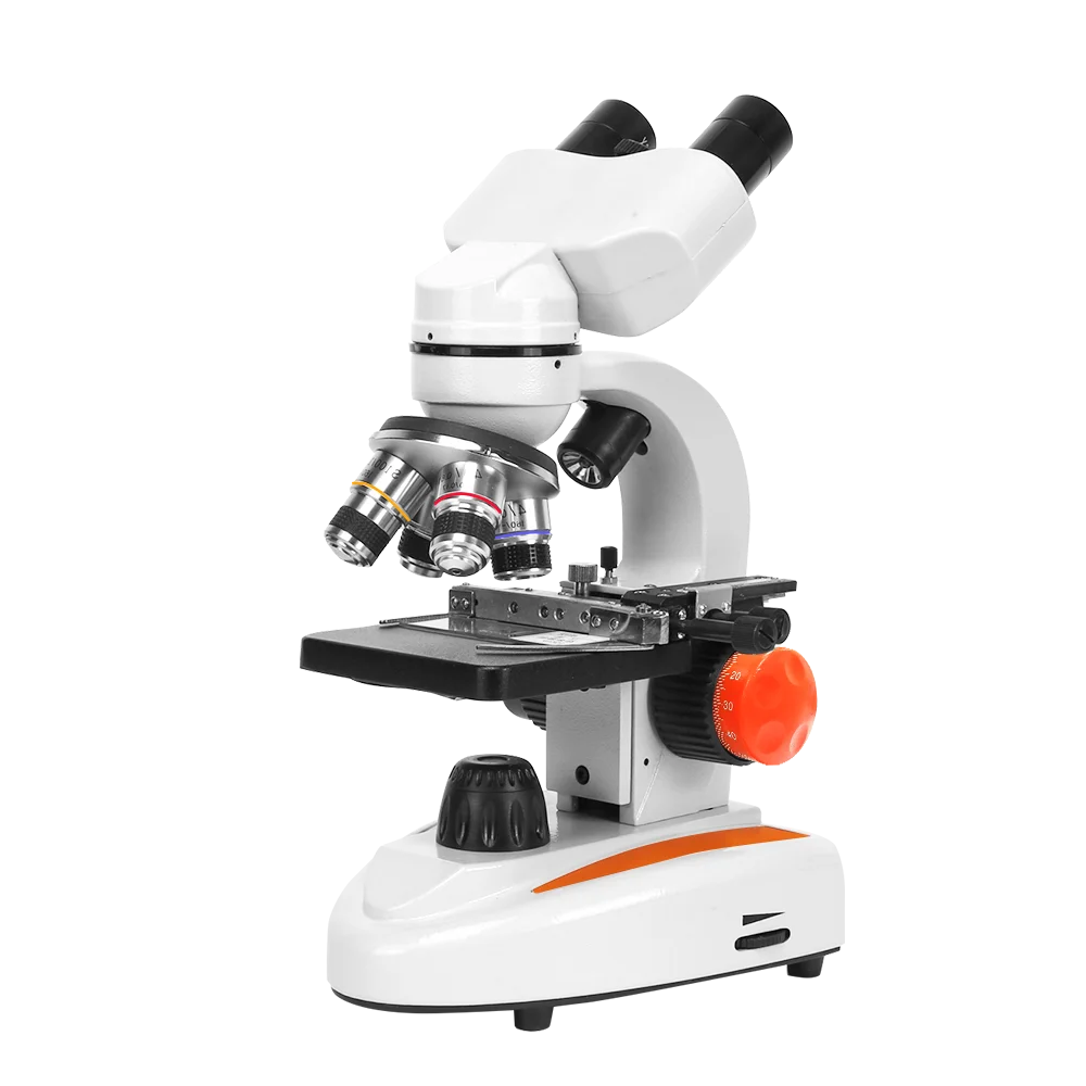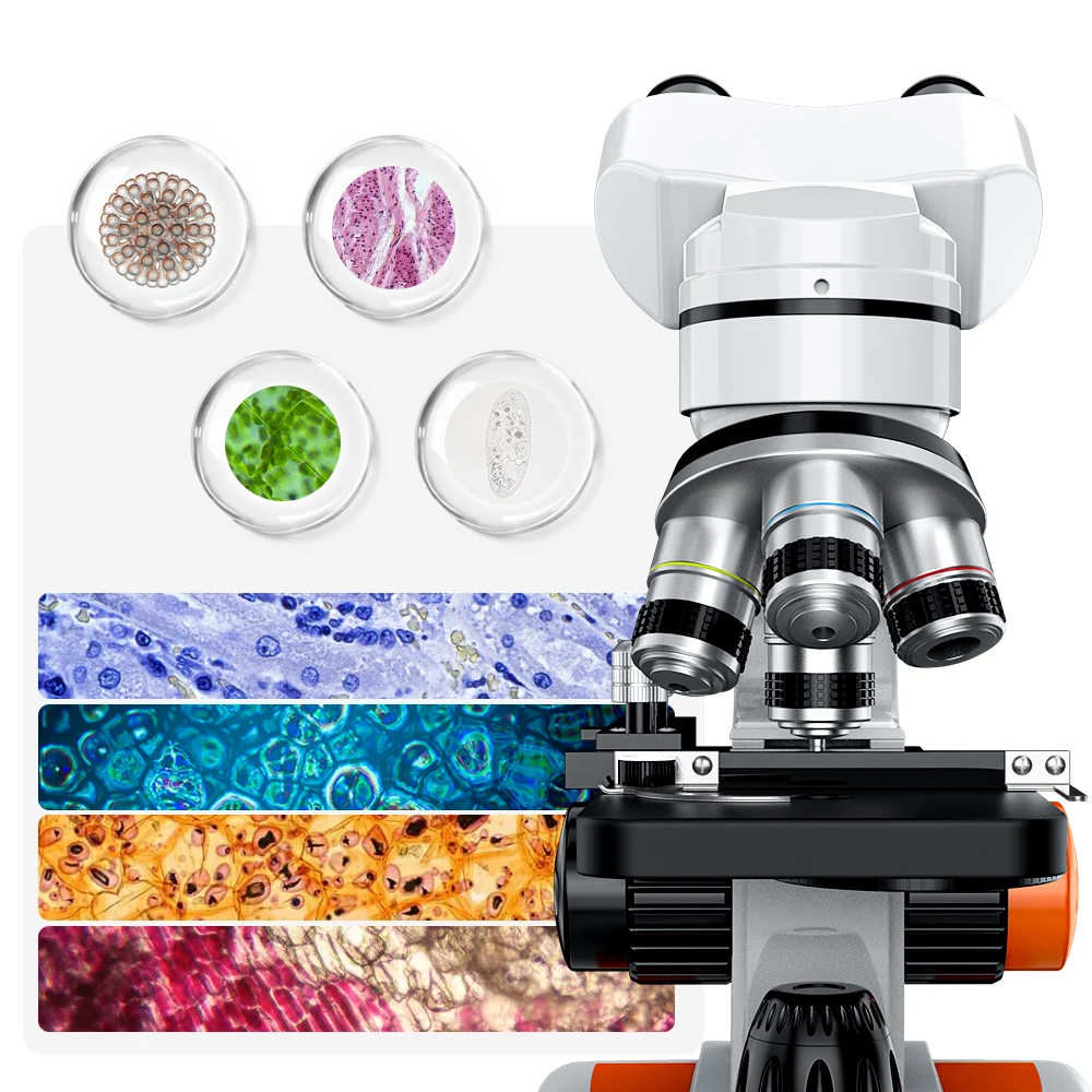 1. Student Biological Microscope Magnification :4X, 10X, and 50X DIN achromatic full-glass objectives in metal barrels that provide high-resolution color-corrected images built with multi-coated highly transparent optical glass with eyepieces WF 10X,WF 50X. 45°inclination with 360°rotation capability reduces eye and neck strain and provides a more comprehensive view and enable sharing.