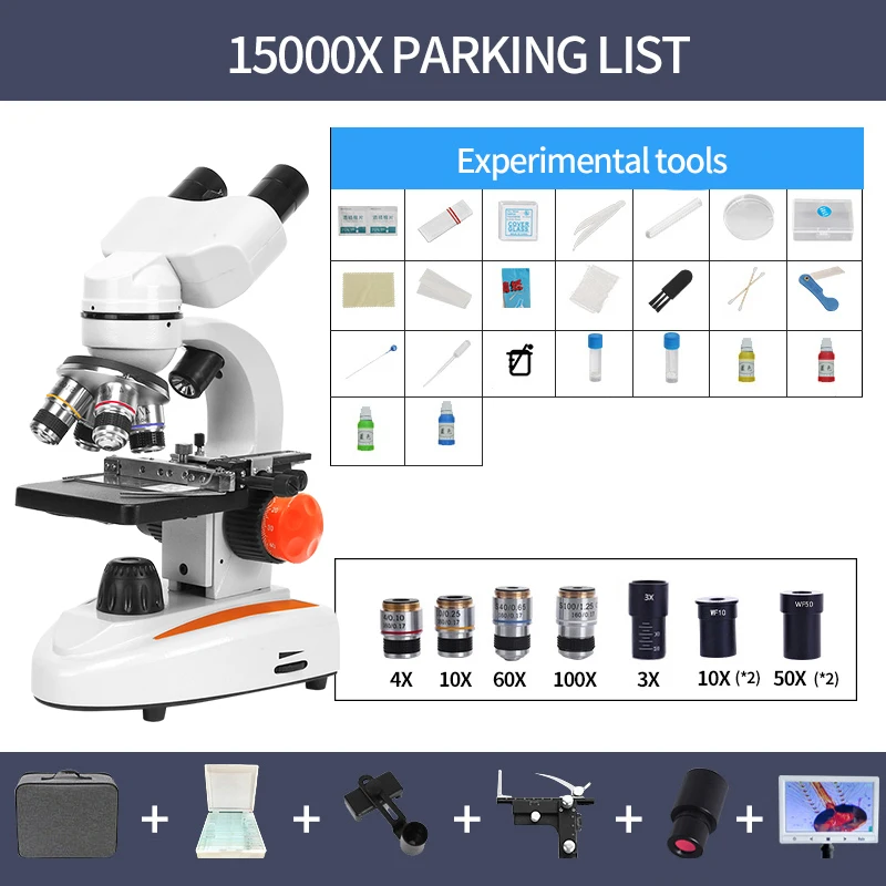 Updated 6000X-15000X Compound Lab Biological Microscope with 10X 40X Eyepieces Double Layer Mechanical Stage With Slides Set