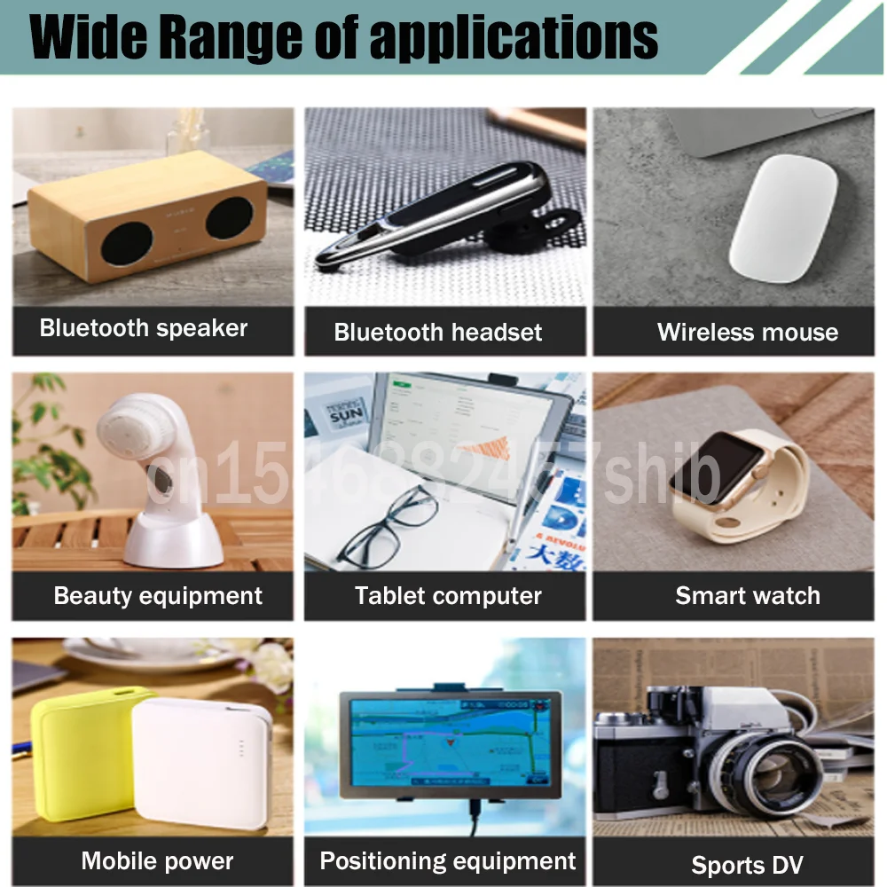 Используется для MP3 ,MP4, GPS трекер, светодиодный светильник, динамик, Тахограф Автомобильный видеорегистратор, Bluetooth наушники, мобильный аварийный источник питания, пульты дистанционного управления, Смарт-часы, MID, PDA, pos машины, интерфон, диктофон, наклонная машина, резервные силы, электрические игрушки и другие электронные устройства и т. Д.