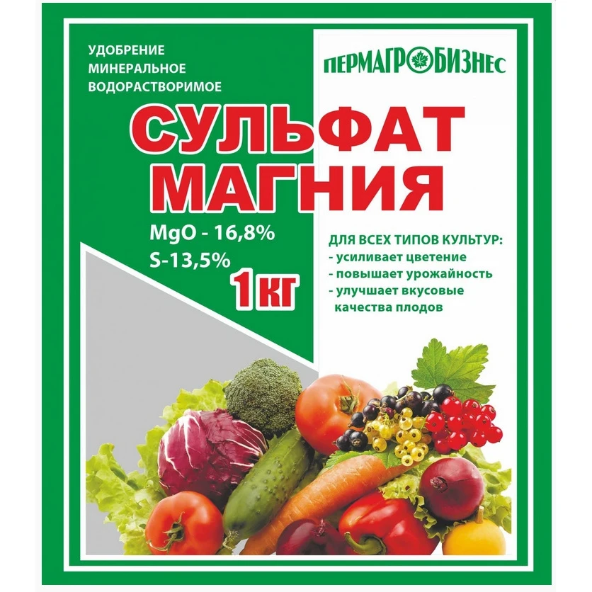 Удобрение минеральное водорастворимое.Для всех типов культур: - усиливает цветение;- повышает урожайность;- улучшает вкусовые качества плодов.Наименование агрохимиката: Агрохимикат Сульфат магния марки: эпсомит гранулированный. MgSO4 - 46%.Массовая доля питательных веществ, не менее: оксид магния (MgO) – 16,8%, сера (S) – 13,5%.Технология применения: в личных подсобных хозяйствах удобрение вносится в сухом виде или в виде водного раствора (удобрение полностью растворяется в воде).Внесение осуществляется с использование типовых технических средств, предназначенных для выполнения агрохимических.При основном внесении: удобрение равномерно рассыпают по поверхности почвы и проводят вспашку, перекопку или рыхление. Для подкормок:1. Удобрение равномерно распределяют посередине рядков или вокруг растений не ближе 8-10 см от стебля с последующей заделкой в почву рыхлением и при необходимости проводят полив. 2. В садах удобрение равномерно распределяют по всей площади приствольного круга плодовых деревьев или кустарников с последующей заделкой рыхлением и перекопкой на полштыка или дозу делят на несколько частей и вносят в канавки (или лунки, буровые скважины), выкопанные на глубину 40-50 см вокруг дерева, при необходимости проводят полив. 3. Для подкормки водным раствором необходимое количество удобрения растворяют в воде и проводят опрыскивание растений или полив (традиционным способом, капельным поливом, орошением). Опрыскивают утром или вечером в сухую безветренную погоду.