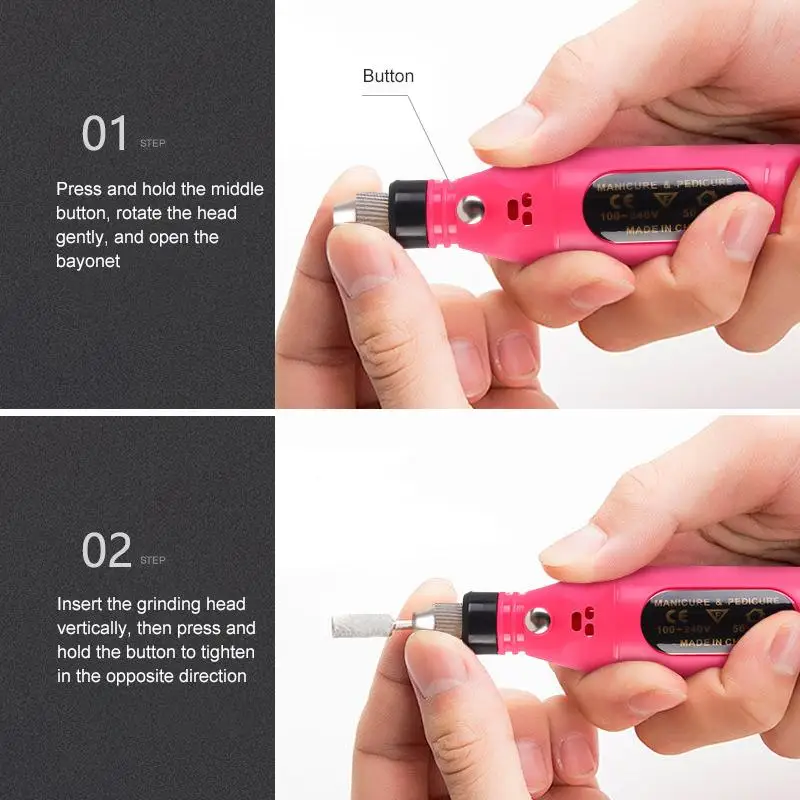 02. Вставьте шлифовальную головку вертикально, затем нажмите кнопку и плотно поверните ее в противоположном направлении