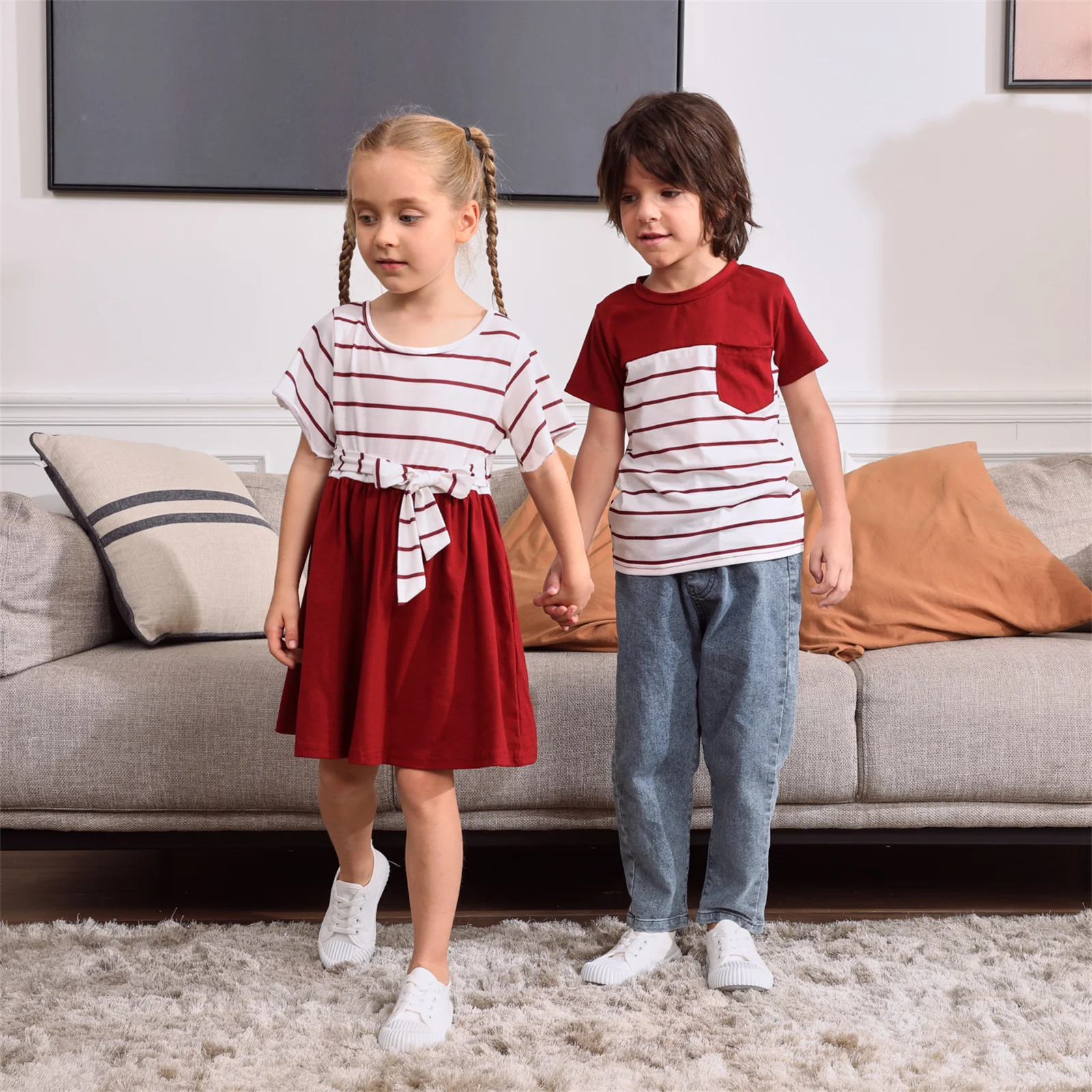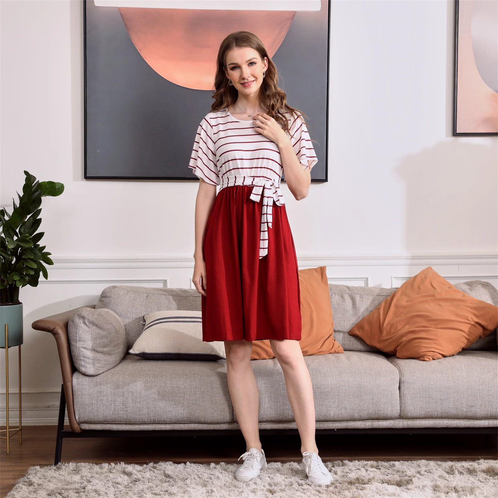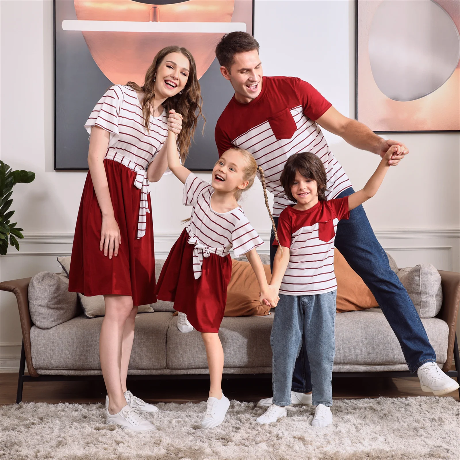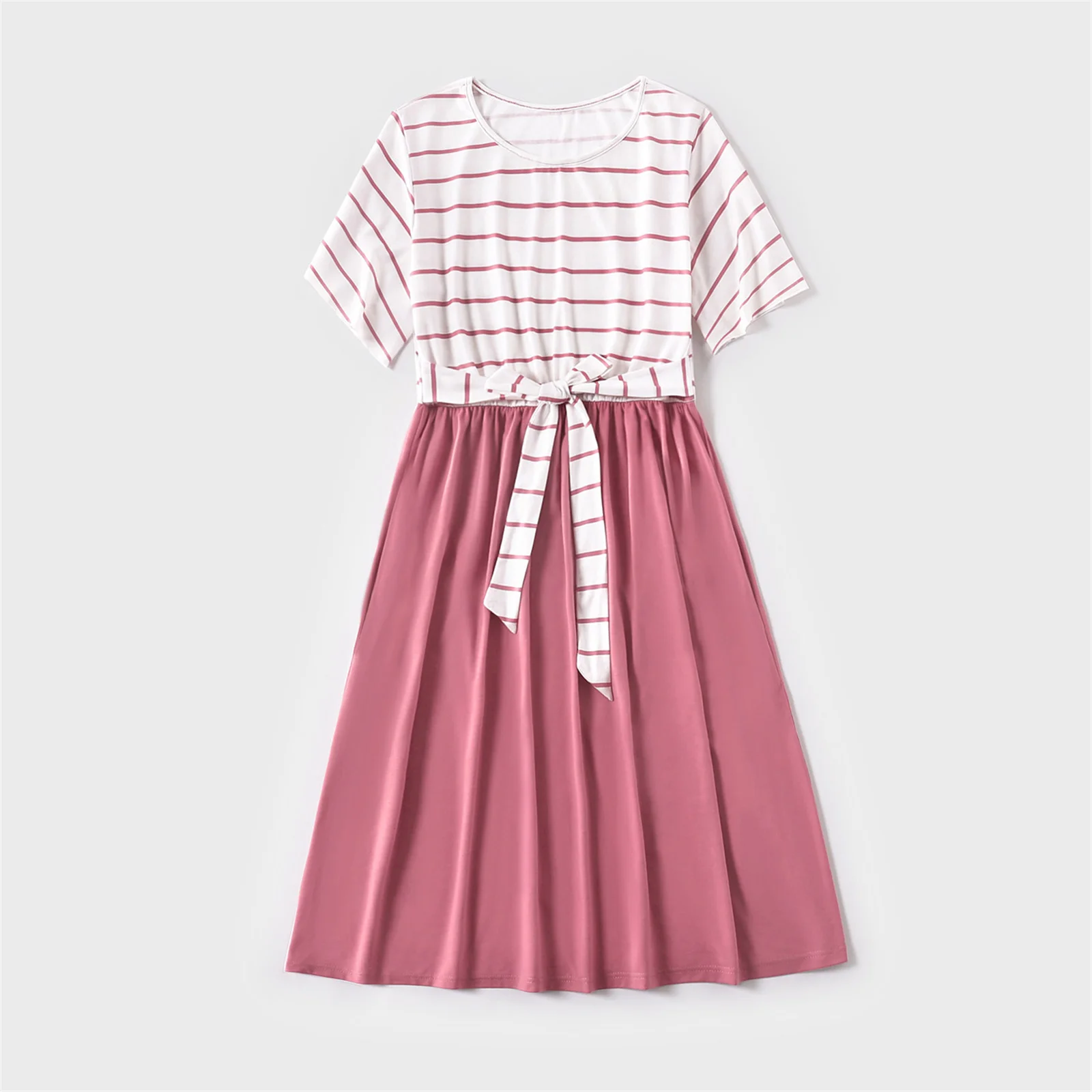 PatPat/Семейные комплекты в красную и белую полоску с короткими рукавами (комбинированные платья и футболки с поясом)
