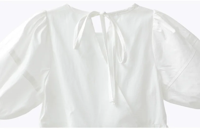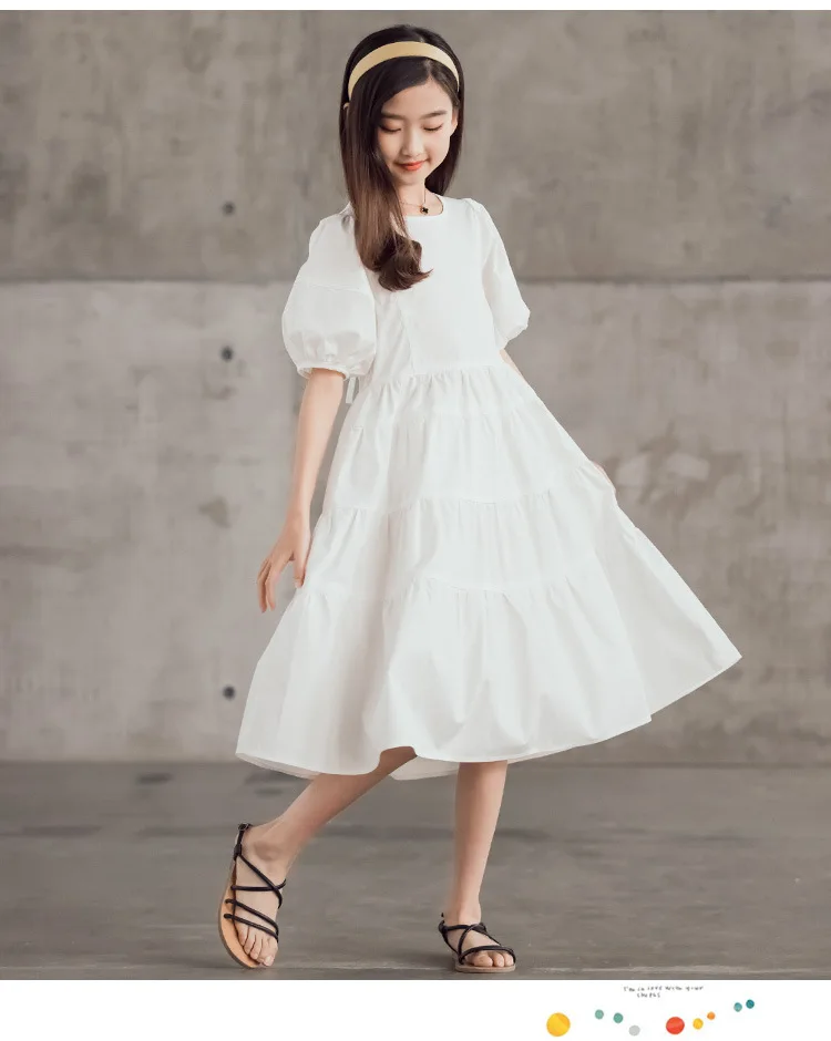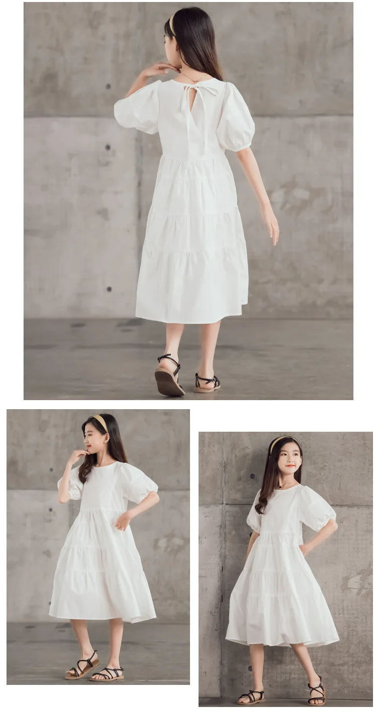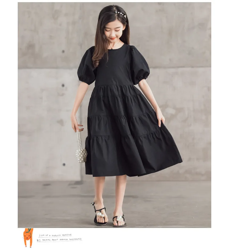 Черные и белые хлопковые платья для девочек корейское детское однотонное платье средней длины с короткими рукавами-фонариками для девочек-подростков 12, 13, 14, 15, 16 лет