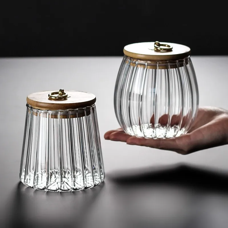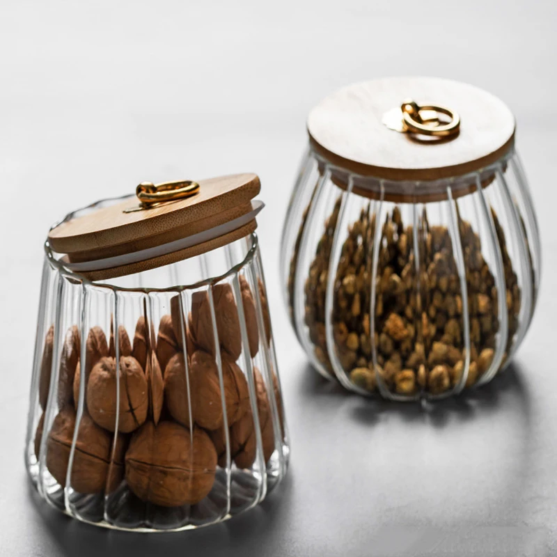 Полосатая стеклянная чаша для сахара, Бамбуковая крышка, металлическое кольцо, герметичная банка, прозрачная Бытовая стеклянная многозернистая банка для хранения, бутылка для хранения