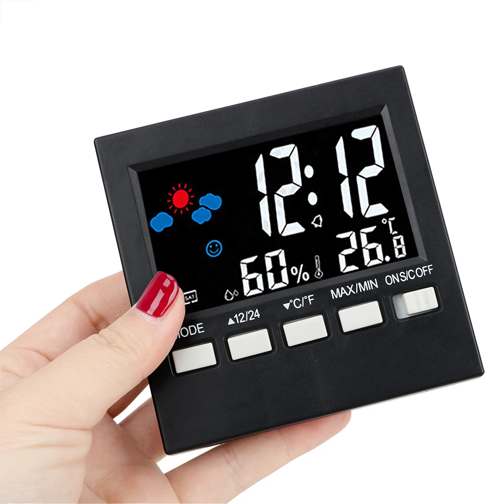 Отображение времени, даты, недели и измерения температуры и влажности.Отображение максимальной и минимальной температуры и влажности.Прогноз погоды: солнечный, частично солнечный, облачный, дождливый и дождливый.C / F блок температуры выбирается.Отображение времени в течение 12/24 часов.Цветной ЖК-дисплей с подсветкой.Функция звукового управления: когда срабатывает сигнализация или издает звук, светодиодный светильник будет включаться.Смысл светильник функция: задняя часть светильник будет автоматически светильник в темное время суток через S/CОн также имеет функции будильника и повтора.Характеристики: