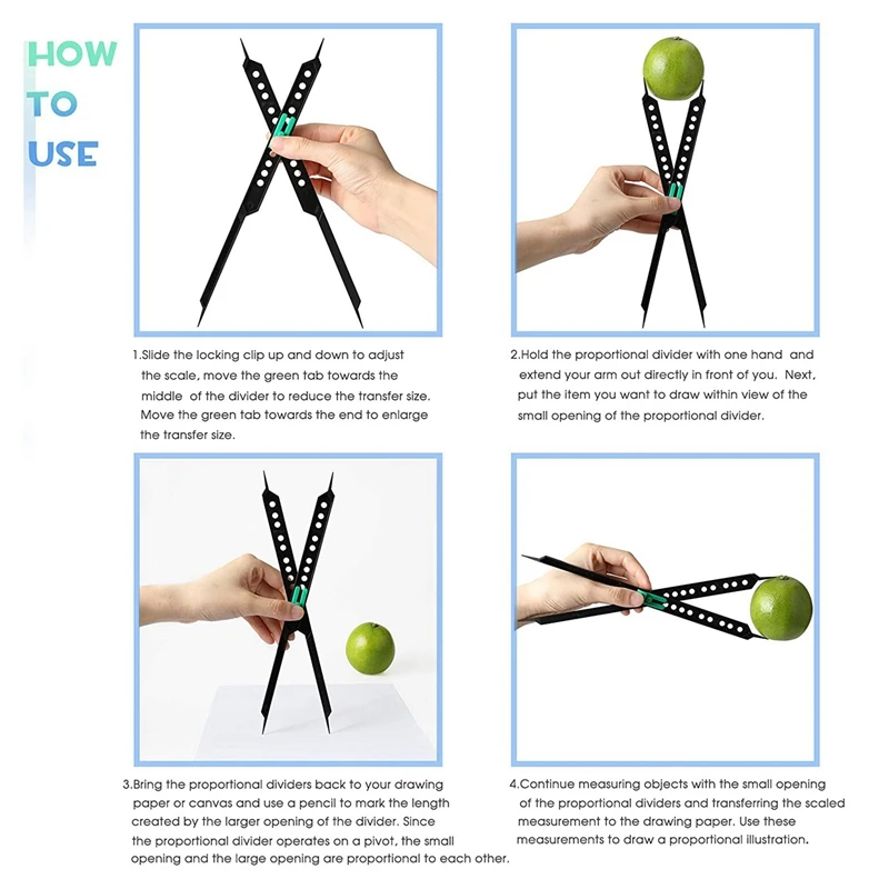 Советы: аккуратно поместите пропорциональные разделители против бумаги для рисования или канавки, чтобы предотвратить перемещение ног. Даже небольшое движение создает неточности в шкале. Всегда измеряйте предметы с пропорциональным разделителем с помощью руки, полностью расширенной, чтобы сохранить ваш метод измерения последовательным.