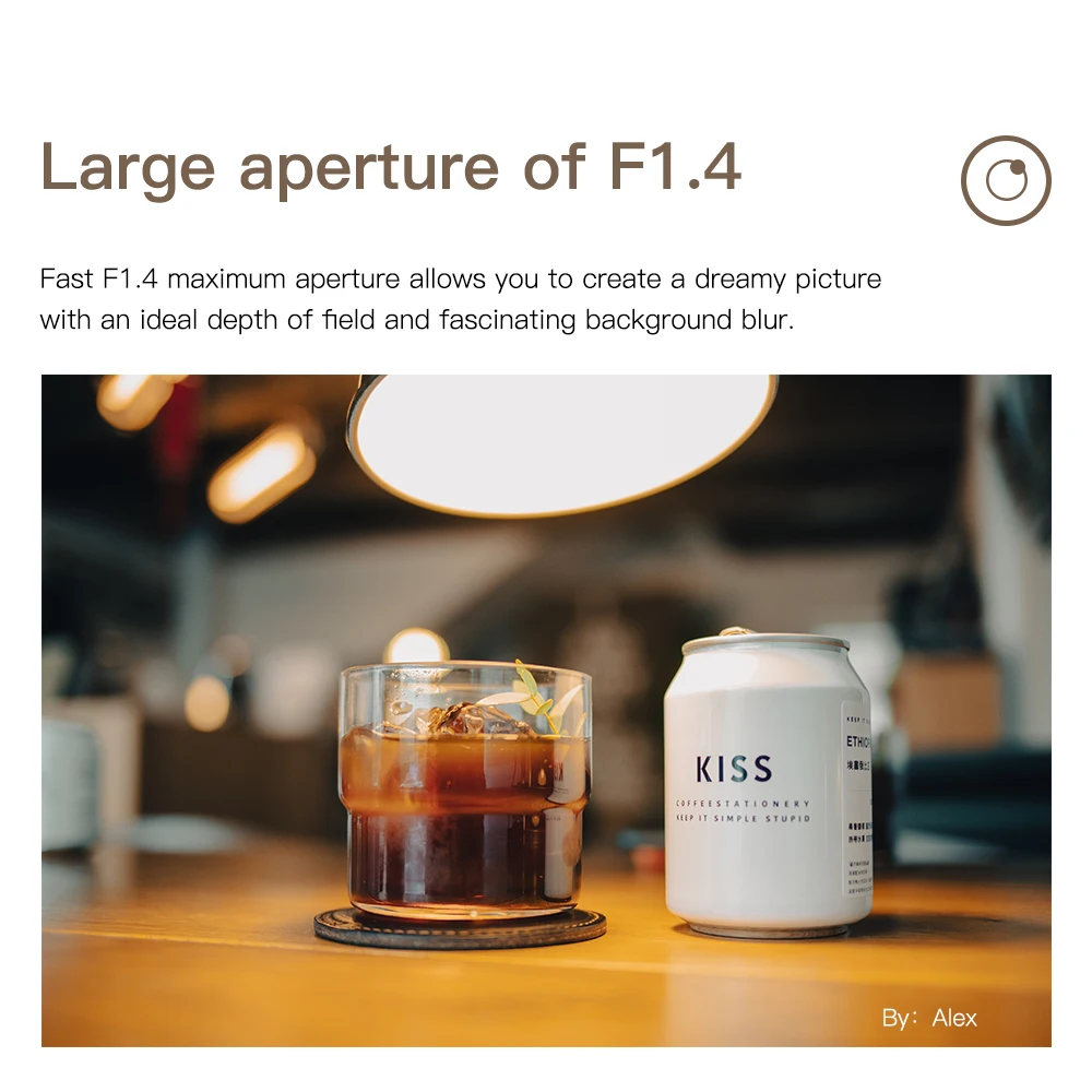 -Яркая Диафрагма: яркая f/1,4 максимальная диафрагма подходит для работы в условиях низкий светильник, а также обеспечивает больший контроль над глубиной поля. Кроме того, 10 лепестковая диафрагма отличается и делает еще более гладкую боке качества.