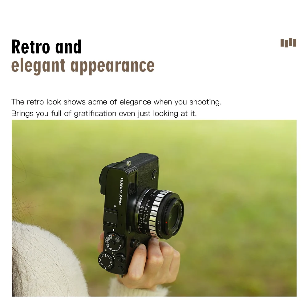-Широкий угол обзора 62 °: дизайн объектива обеспечивает угол обзора 62 °, чтобы создать четкий вид, он идеально подходит для натюрмортов, крупным планом, улиц, И фотография для путешествий.