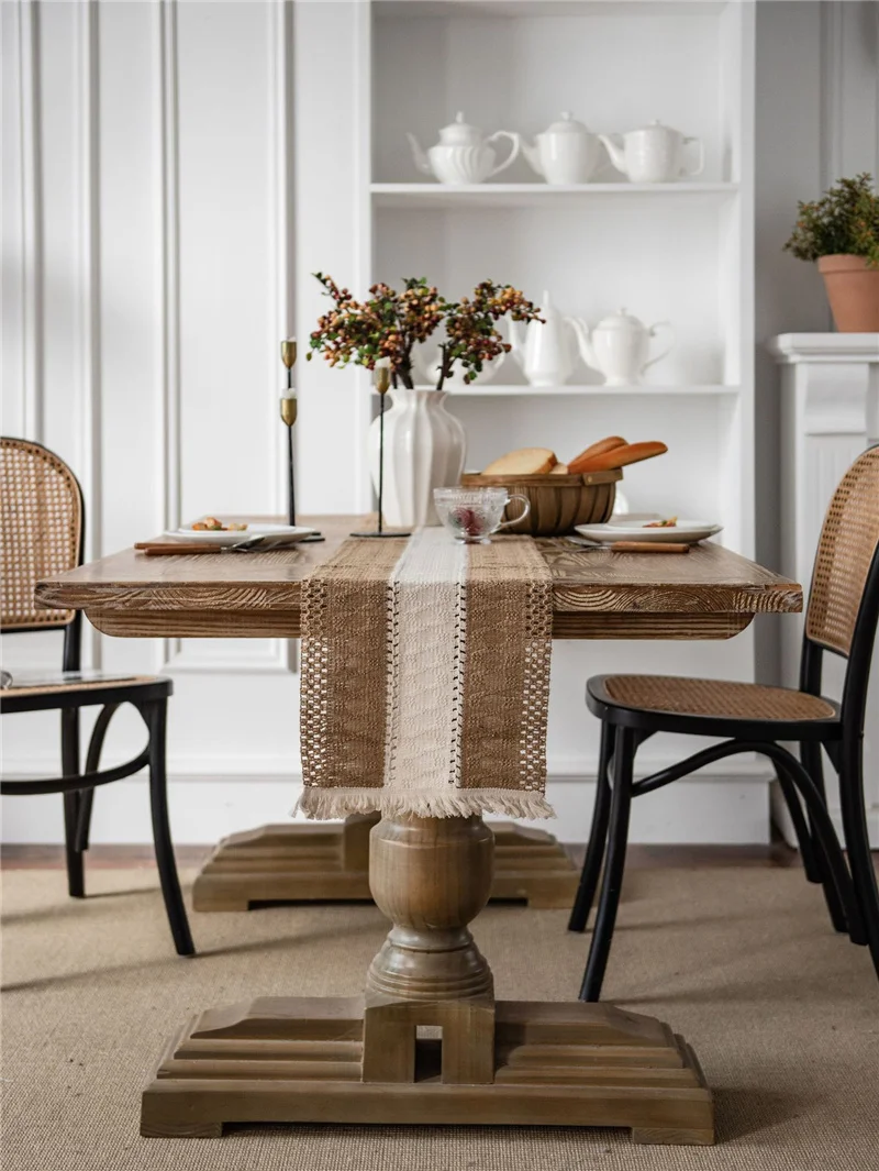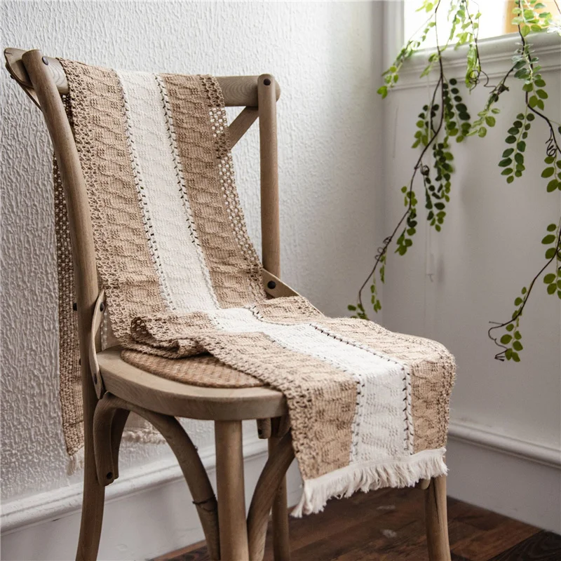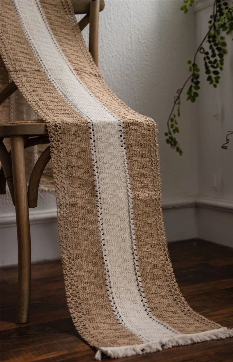 Бегунок для стола с мешковиной из тонкой бежевой и плетеной хлопковой ткани в полоску с кисточками, придавая минималистическое ощущение и подвеска бохо, чтобы придать вашему столу новый вид. Обновите свой дизайн интерьера сегодня. Пусть ваша семья или друзья удивят и оценят