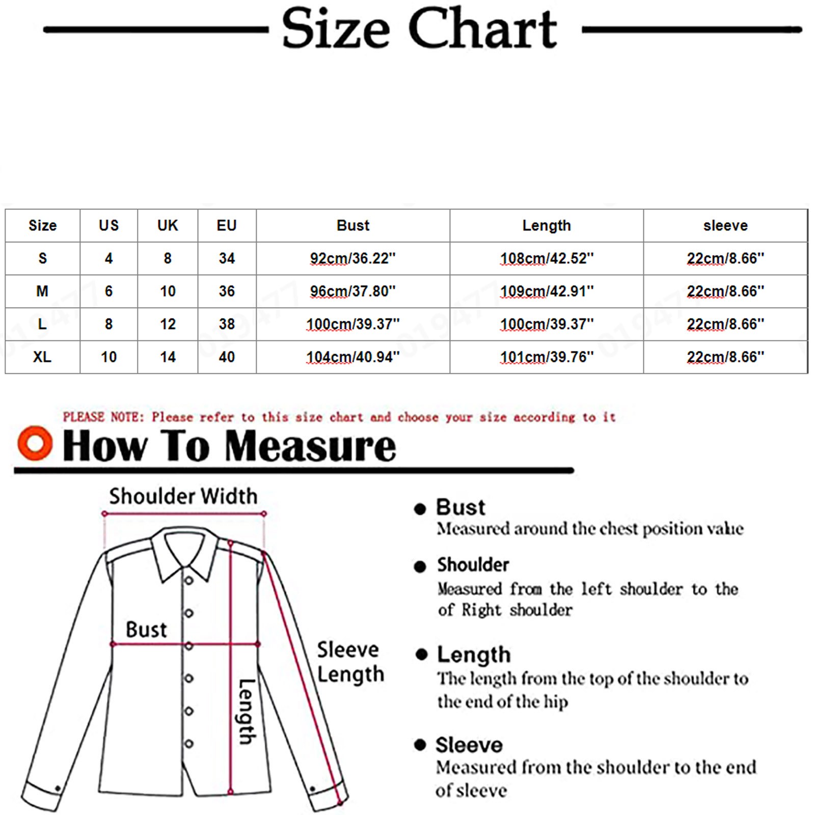 Размер Свяжитесь с нами Великобритания ЕС Обхват груди Длина Рукава S 4 8 34 92 см/36,22'' 108 см/42,52'' 22 см/8,66'' М 6 10 36 96 см/37,80'' 109 см/42,91'' 22 см/8,66'' L 8 12 38 100 см/39,37'' 100 см/39,37'' 22 см/8,66'' XL 10 14 40 104 см/40,94'' 101 см/39,76'' 22 см/8,66''