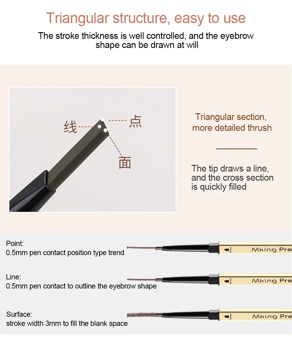 1. Карандаш для бровей, макияж бровей с двойными концами, точные контуры, легко оттеняет, равномерно заполняет брови. Используя тонкую точку карандаша с треугольными наконечниками, создайте штрихи, надавливая на светильник и проводя в направлении роста волос.