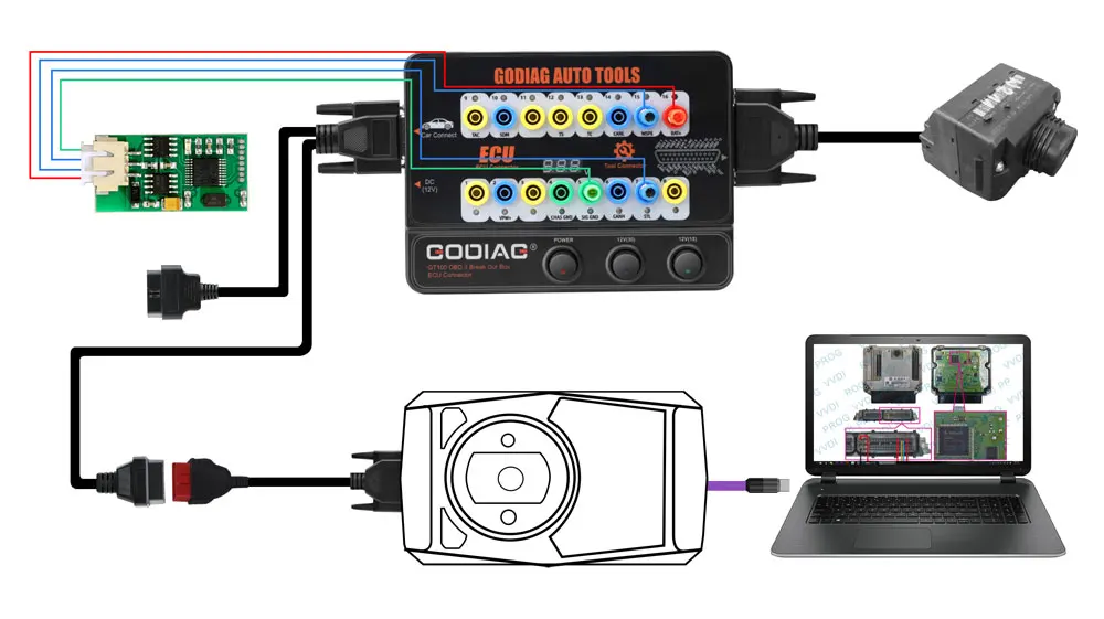 2. Подключение ECU: один модуль подключения Godiag GT100, подключенный к одному модулю ECU, удобен для пользователя для диагностики и программирования одного модуля.