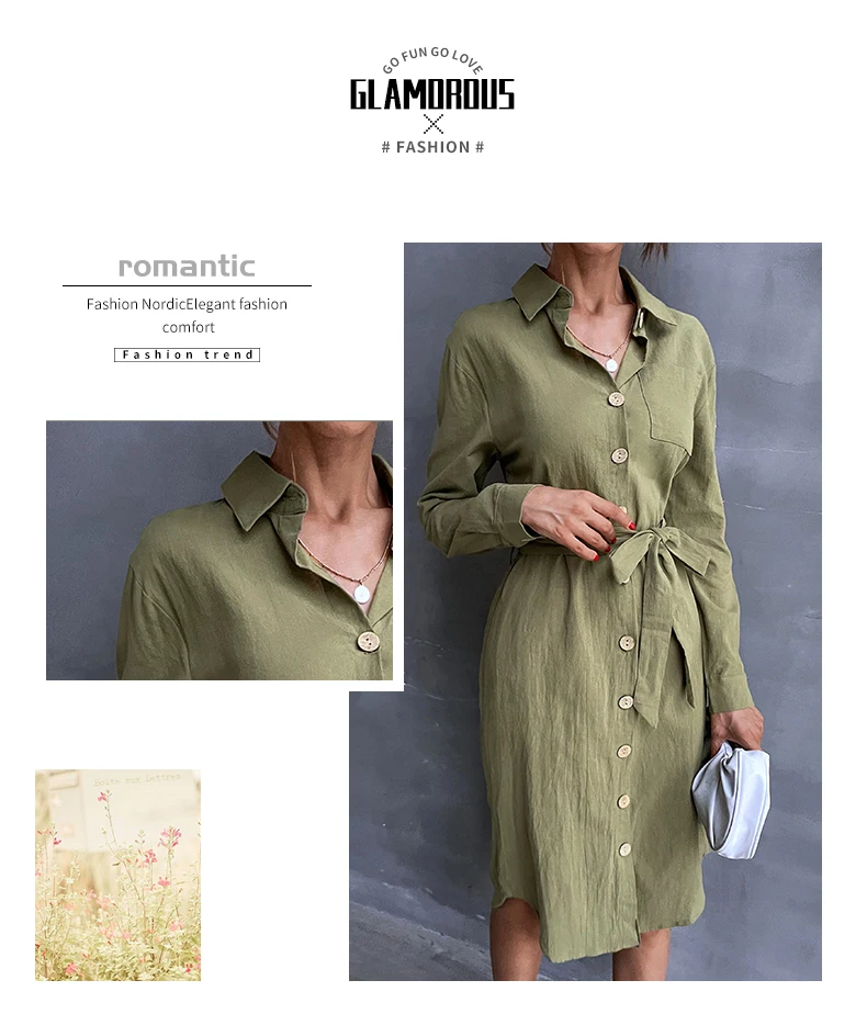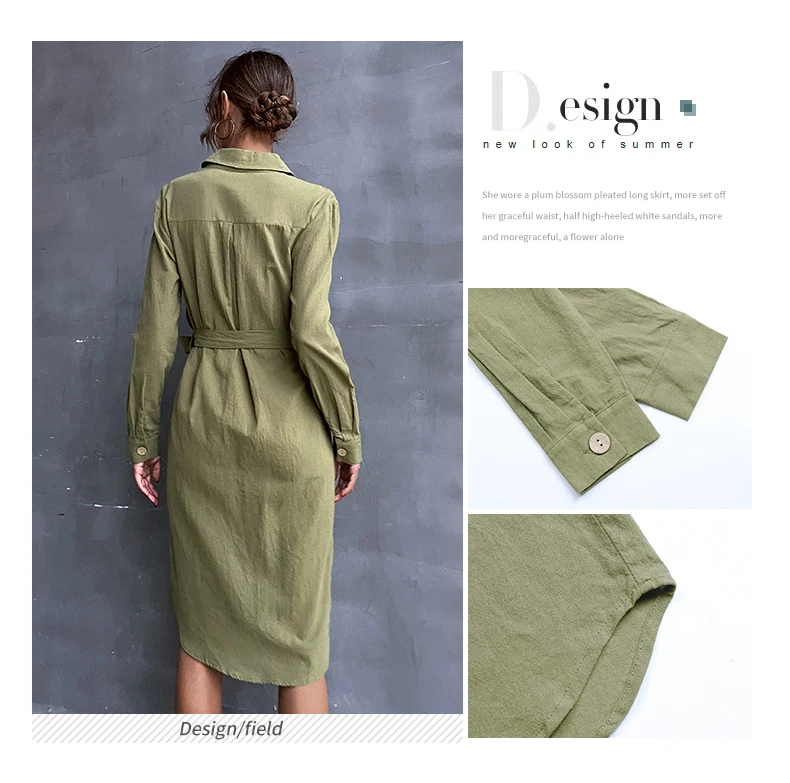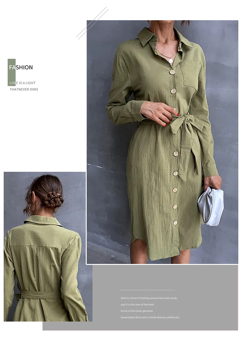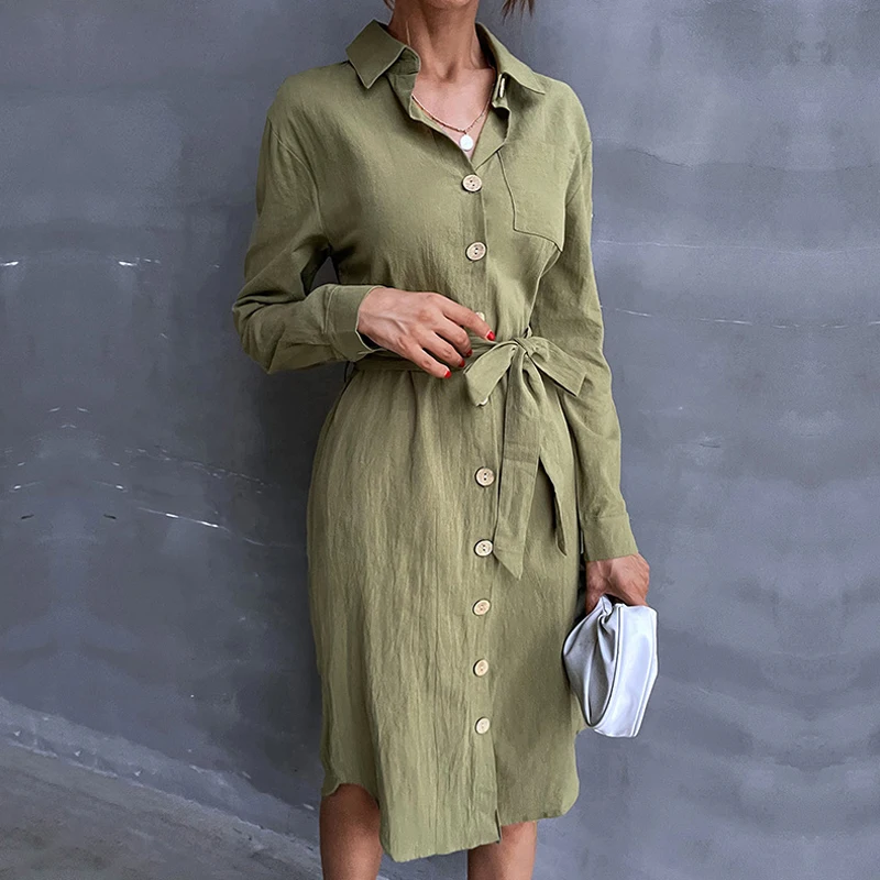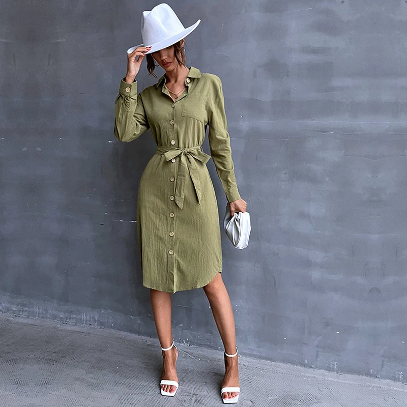 2022 весна и осень женская новая продукция Ретро Повседневная Однотонная рубашка с отворотом приталенное однобортное зеленое платье на шнуровке