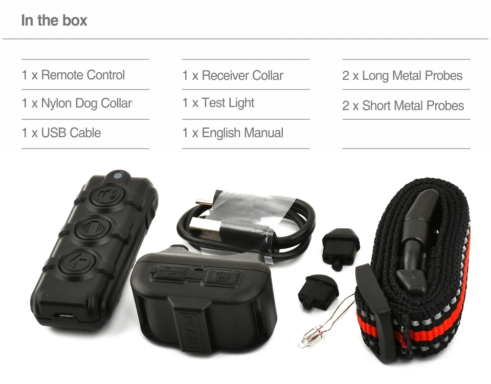 2. Включает в себя один ошейник, пульт дистанционного управления может управлять до двух ошейников.