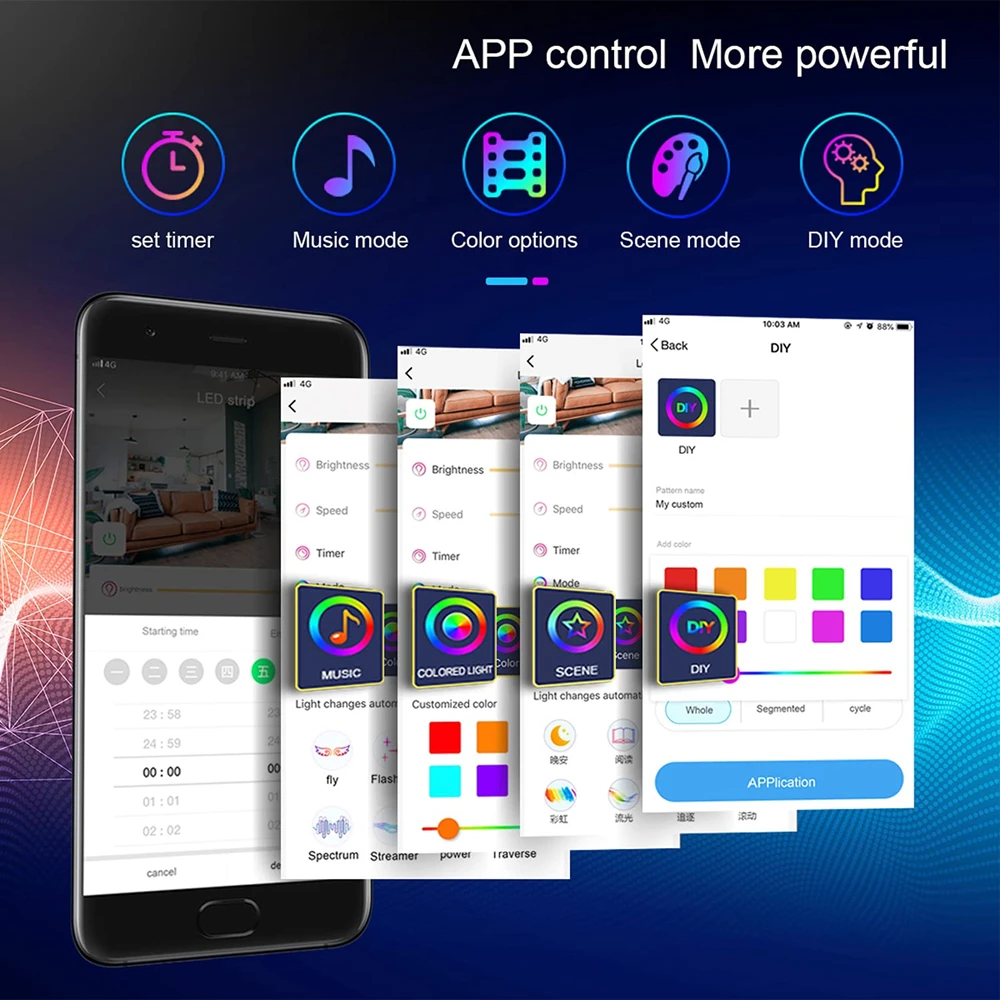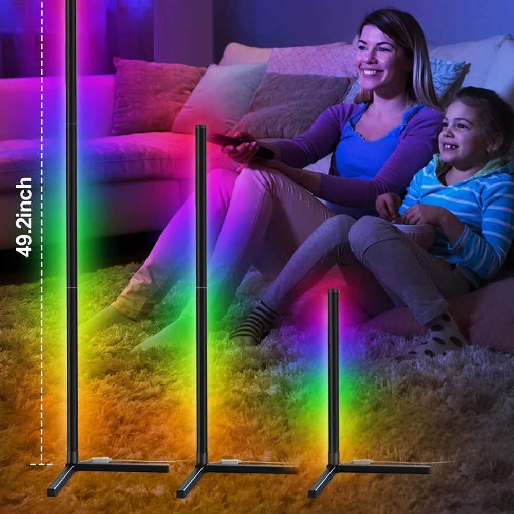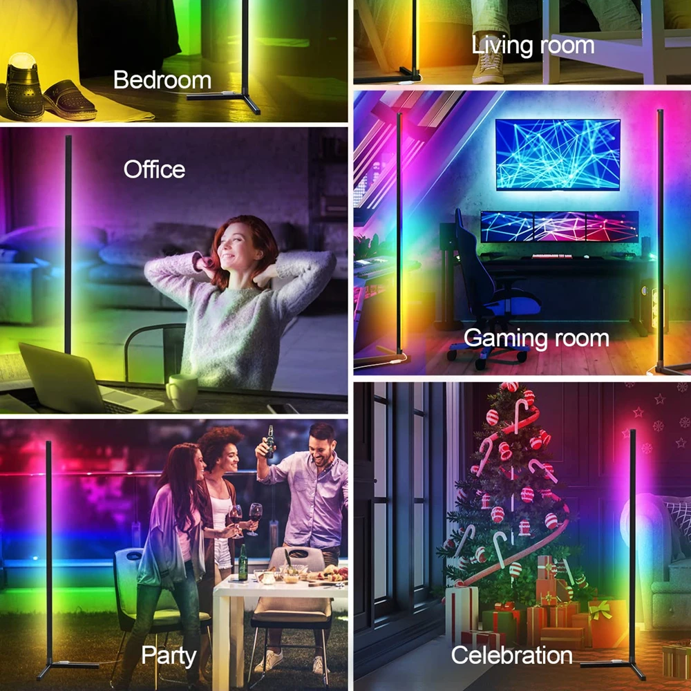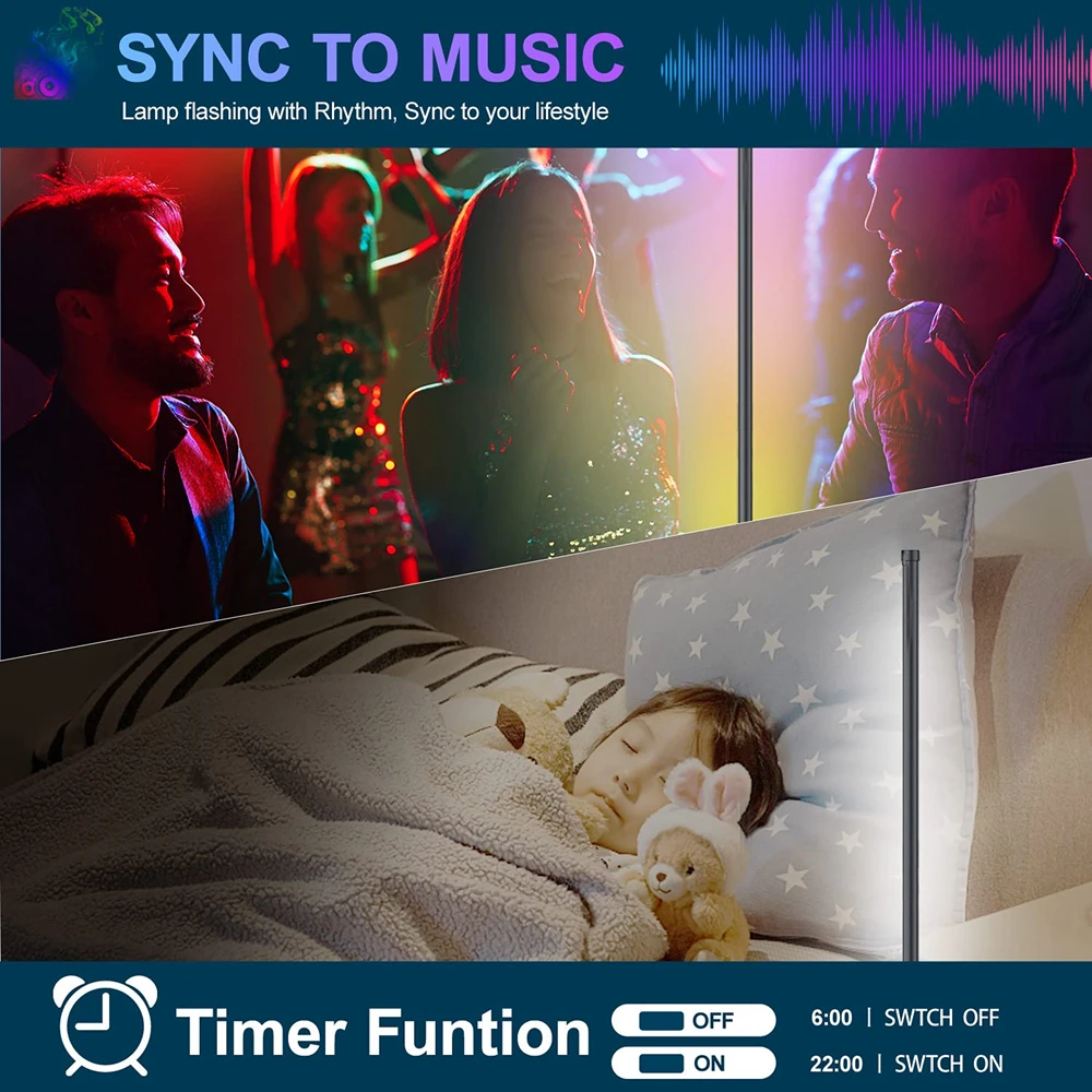 2) тройной метод управления. Угловой торшер управляется с помощью пульта дистанционного управления и управления с помощью приложения, который легко переключает цвет, яркость, эффект освещения и время. С помощью встроенного микрофона или музыкального проигрывателя приложения, RGB торшер автоматически изменяет цвет и световой эффект с ритмом музыки, создавая идеальную атмосферу вечеринки.