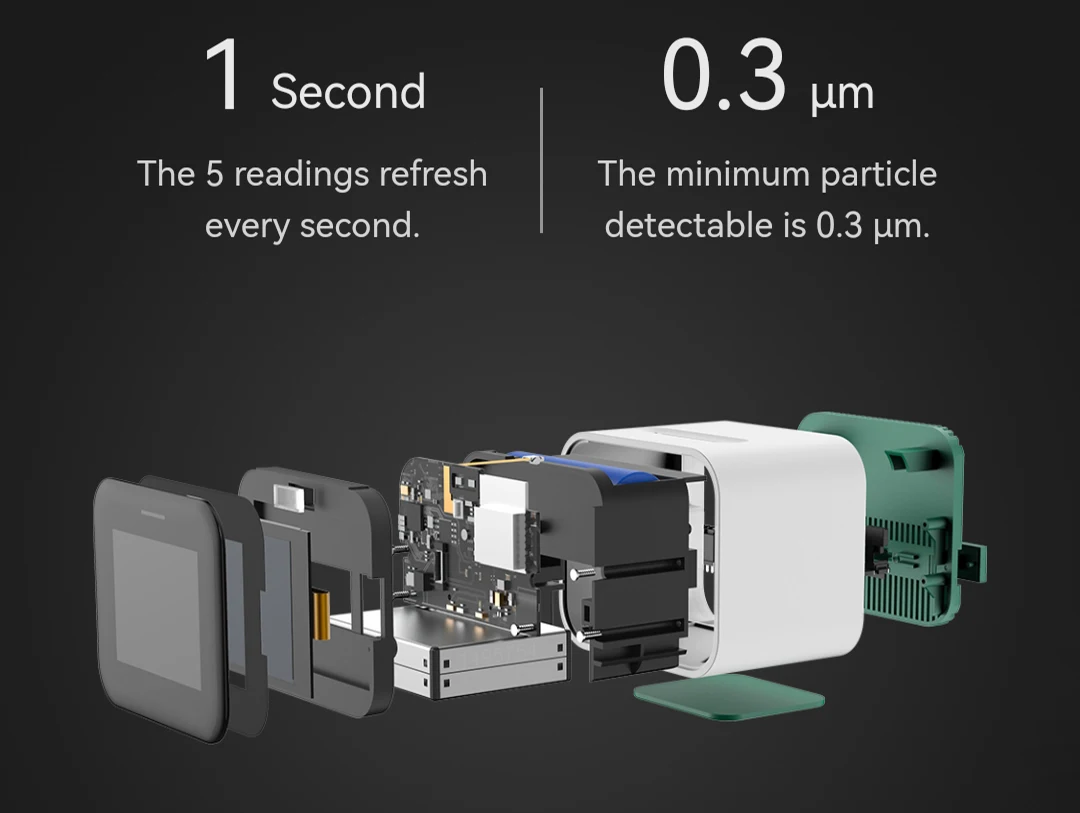 Он отслеживает 5 основных факторов качества воздуха в помещении, включая PM2.5, PM10, CO₂, температуру и влажность.