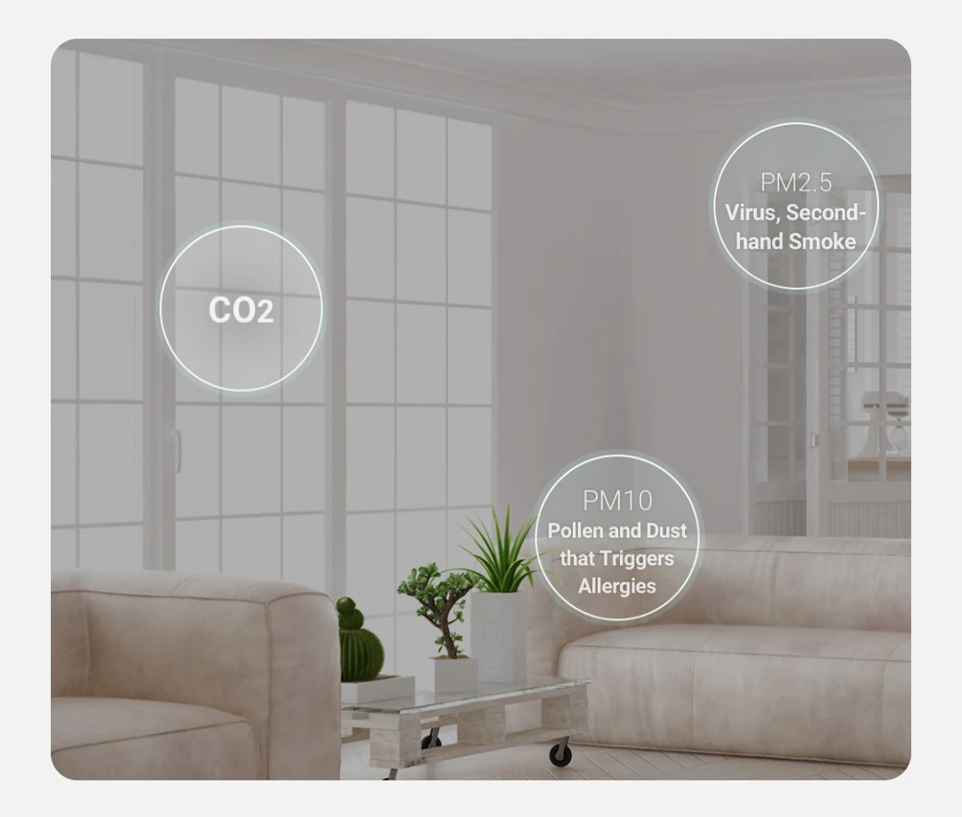 Чистый и свежий воздух требует вашего внимания, если вы хотите, чтобы ваш дом был здоровым для вас и вашей семьи. CO₂ имеет свою репутацию, чтобы показать, достаточно ли свежий воздух, и высокий уровень CO₂ приведет к сонливости. Частицы также имеют значение, особенно мелкие частицы пыли, такие как PM2.5, могут проникать в нашу сердечно-сосудистую систему и привести к тяжелым воздействиям на здоровье.