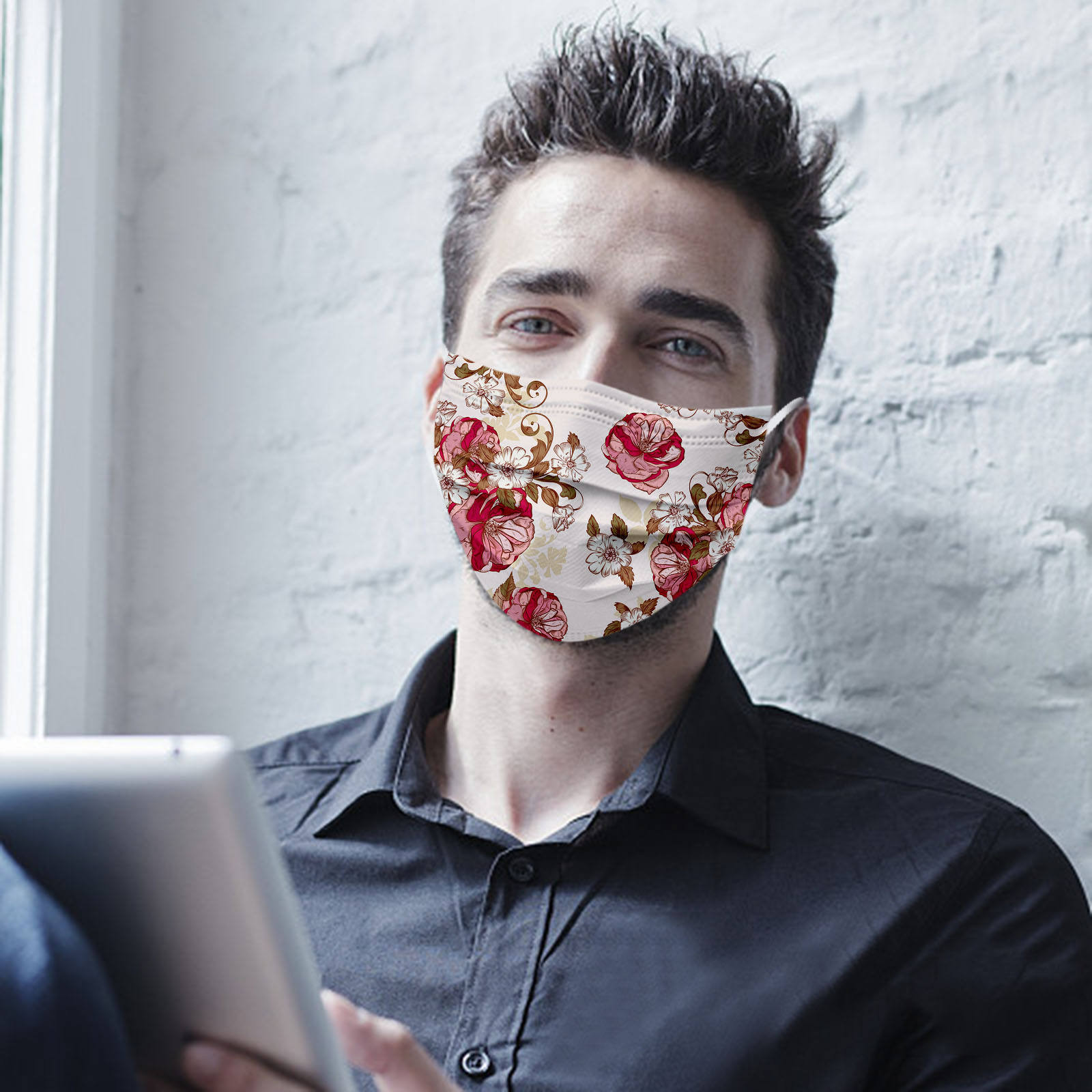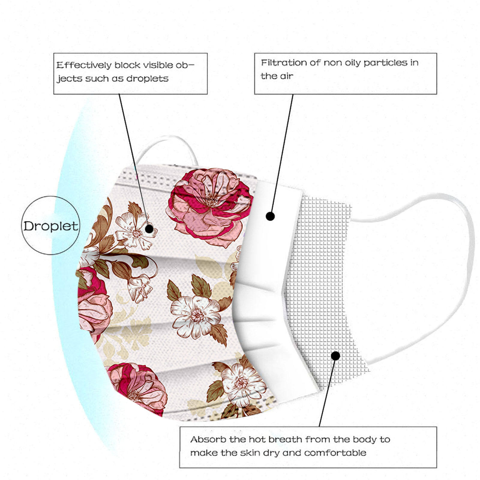 В 3 слоя Нетканая одноразовая маска изготовлена из 3 слоев нетканого материала, Безопасен и безопасен для использования. Дышащий материал и милый Узоры, которые делают его полезным и модным. Специальный 3 слоя из нетканого материала Дизайн, обеспечивает некоторую защиту от пыли, автомобильных выхлопных газов, Пыльца и т. д. эластичная Ушная петля, легко носить и не давит на уши. Маникюрный салон или любые другие области, где может потребоваться защита