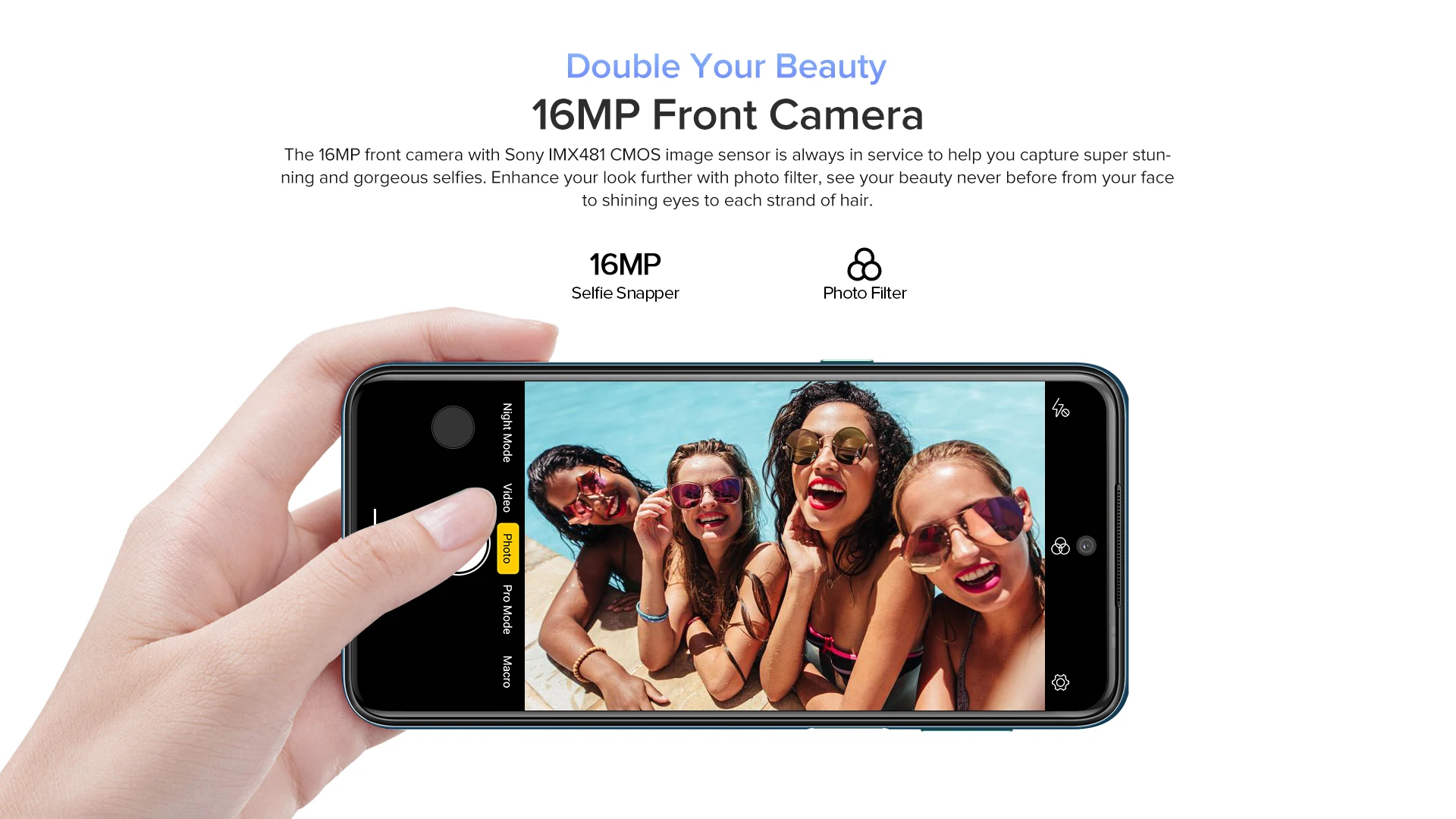 Фронтальная камера 16 МПФронтальная камера 16 МП с сенсором изображения CMOS Sony IMX481 всегда в обслуживании, чтобы помочь вам запечатлеть супер Потрясающие и великолепные селфи. Улучшите свой внешний вид с помощью фотофильтра, никогда не смотрите на вашу красоту с лица на сияющие глаза на каждую прядь волос.
