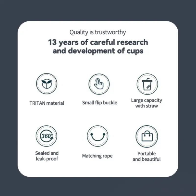 Материал: корпус чашки: Корейский SK tritan, покрытие: PE, прозрачная маленькая крышка: PC, соломенное уплотнительное кольцо: силикагель