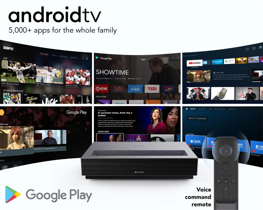 <Умный проектор, встроенные приложения 5K>: Nova-это умный проектор, который поставляется с тысячами приложений на кончиках ваших пальцев, оснащенных Android TV. Транслируйте ваши любимые шоу из Hulu, HBO Max, Showtime, Disney + и многое другое. Используйте кнопку голосовой команды, чтобы сообщить Nova, что вы хотите посмотреть. Примечание: Netflix поддерживается, но требуется Fire TV stick или аналогичное потоковое устройство.