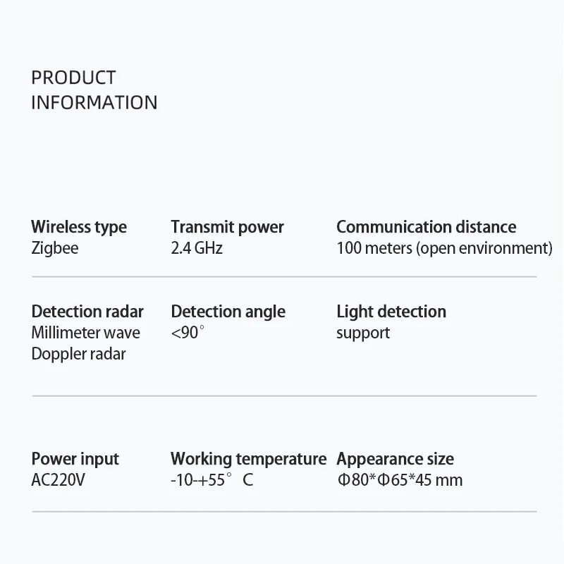 This product solves the pain points that traditional human sensors cannot detect the presence of a static human body. Using advanced infrared radar technology, it can accurately detect whether there are people in the area, whether it is active or static.