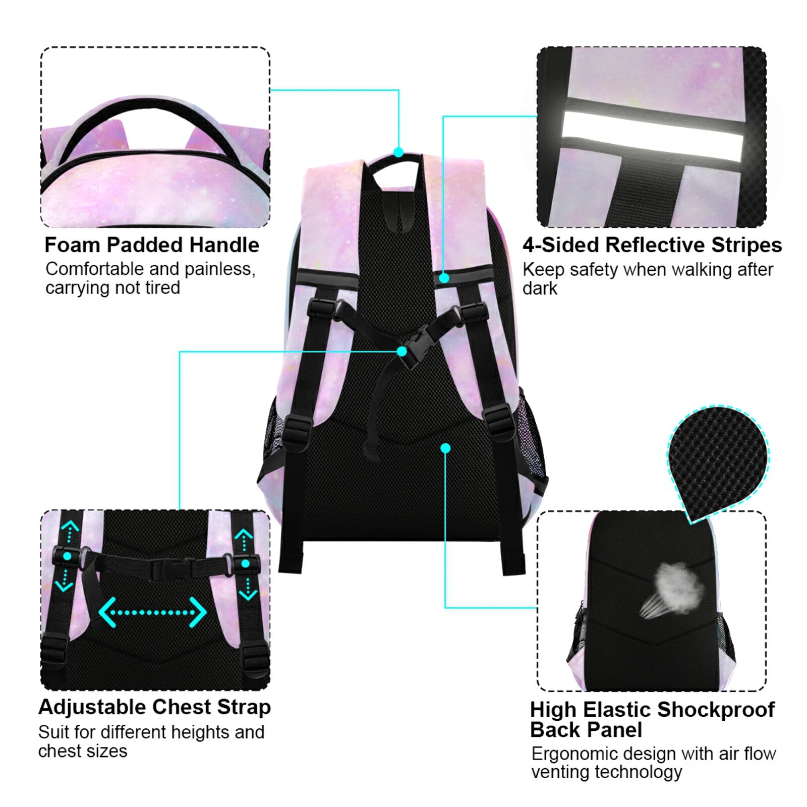 Сумка на молнии спереди в школьном рюкзаке имеет светоотражающие полоски, а также две светоотражающие полоски на ремешке и сетчатые карманы с обеих сторон, который будет иметь очевидный отражающий эффект при освещении ночного света, который играет защитную роль. Ремешок крепится с регулируемой по высоте пряжкой, чтобы предотвратить скольжение ремня
